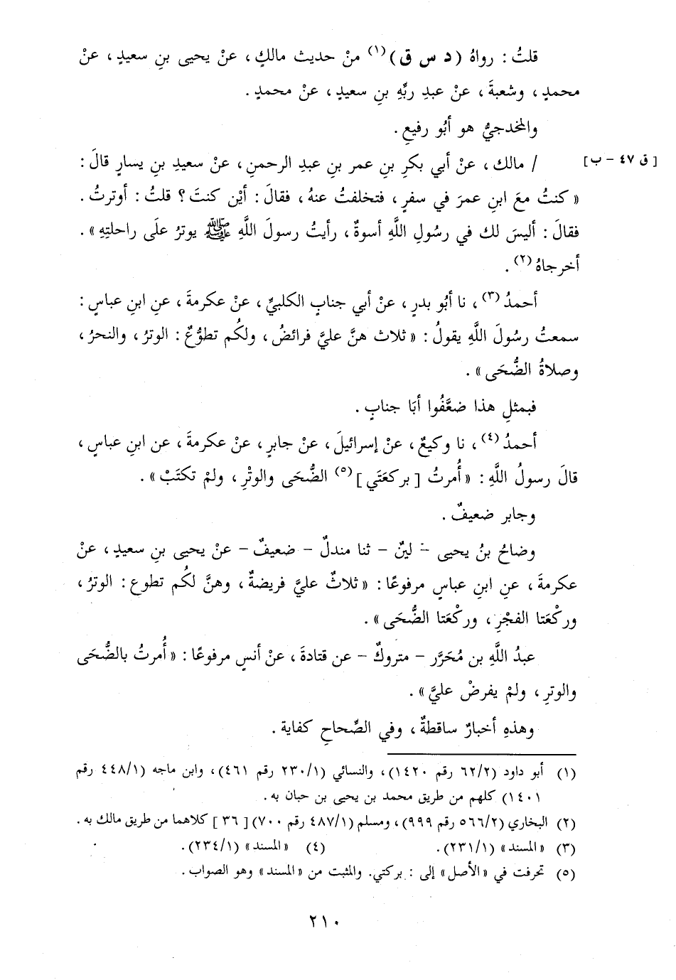 [ق 47 - ب] / مَالك، عنْ أبي بكرِ بن عمر بن عبد الرَّحْمَن، عَن سعيد بن يسَار قالَ: " كنتُ معَ ابنِ عمرَ فِي سفرٍ، فتخلفتُ عنهُ، فقالَ: أيْن كنتَ؟ قلتُ: أوترتُ. فقالَ: أليسَ لَك فِي رسولِ اللهِ أسوةٌ، رأيتُ رسولَ الله [صلى الله عَلَيْهِ وَسلم] يوترُ علَى راحلتِهِ " أخرجاهُ.