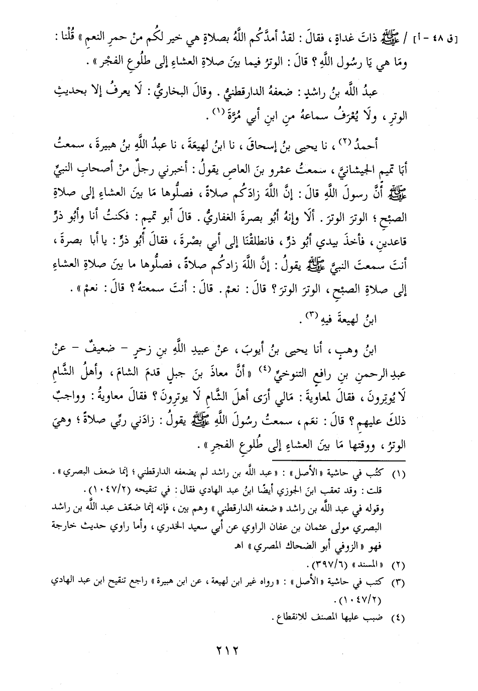 عبد الله بن رَاشد: ضعفهُ الدَّارقطنيُّ. وَقَالَ البُخَارِيّ: لَا يعرفُ إِلَّا بِحَدِيث الوترِ، ولاَ يُعْرَفُ سماعهُ منِ ابنِ أبي مُرَّةَ.