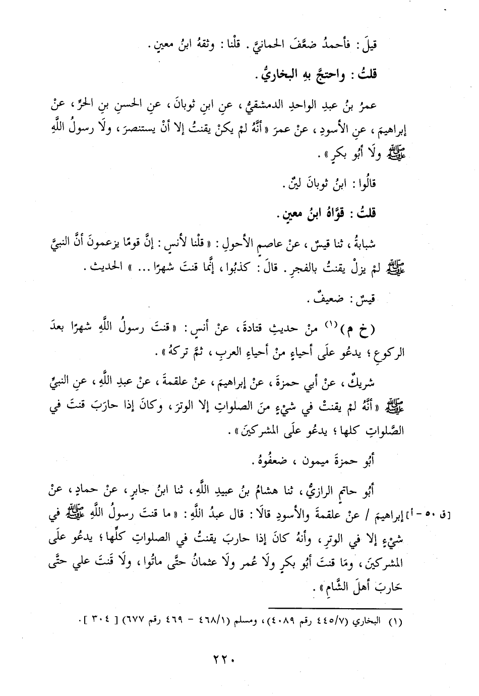 أَبُو حَاتِم الرَّازِيّ، ثَنَا هِشَام بن عبيد لله، ثَنَا ابْن جَابر، عَن حَمَّاد، عَن إِبْرَاهِيم [ق 50 - أ] / عَن علقمةَ والأسودِ قَالَا: قَالَ عبد الله: " مَا قنتَ رسولُ الله [صلى الله عَلَيْهِ وَسلم] فِي شَيْء إِلَّا فِي الْوتر، وَأَنه كانَ إِذا حَارب يقنتُ فِي الصَّلَوَات كلهَا؛ يَدْعُو على المشركينَ، وَمَا قنتَ أَبُو بكر وَلَا عمر وَلَا عثمانُ حَتَّى مَاتُوا، وَلَا قنتَ عَليّ حَتَّى حارَبَ أهلَ الشامِ ".