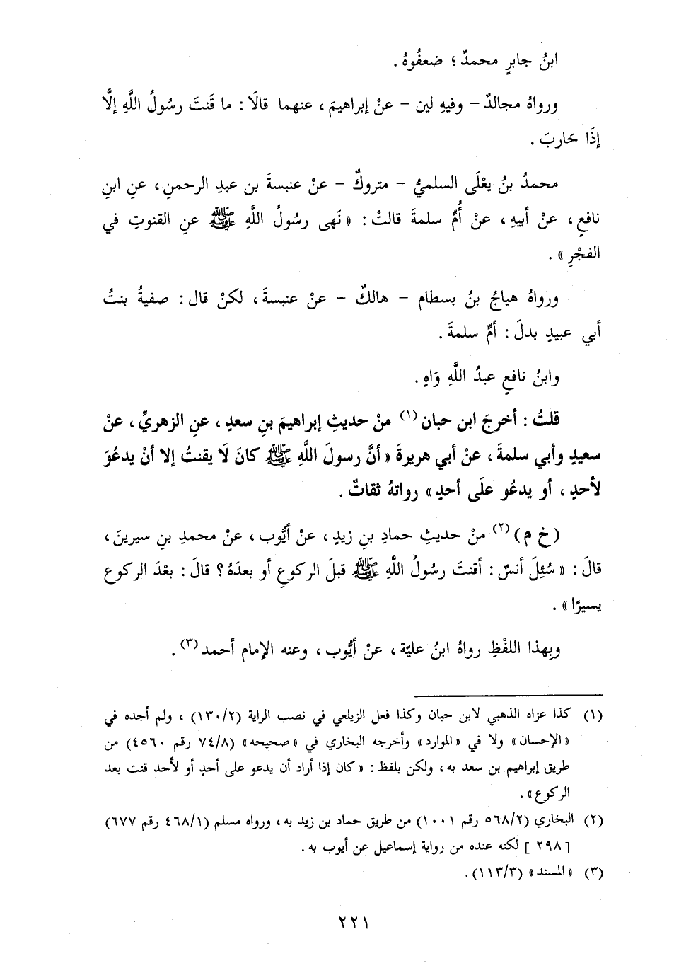 قلتُ: أخرج ابْن حبَان منْ حديثِ إبراهيمَ بنِ سعدٍ، عنِ الزهريِّ، عنْ سعيدٍ وَأبي سلمةَ، عنْ أبي هريرةَ " أنِّ رسولَ اللهِ [صلى الله عَلَيْهِ وَسلم] كانَ لاَ يقنتُ إِلَّا أنْ يدعُوَ لأحدٍ، أَو يدعُو علَى أحدٍ " رواتهُ ثقاتٌ.