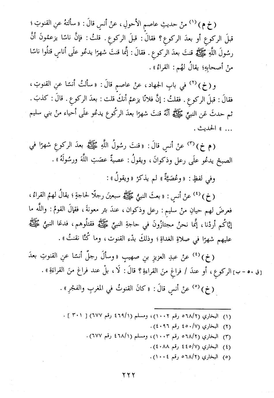 ثمَّ حدثَ عَن النَّبِي [صلى الله عَلَيْهِ وَسلم] أَنه قنتَ شهرا بعدَ الرُّكُوع يدعُو على أَحيَاء من بني سليم ... " الحَدِيث.