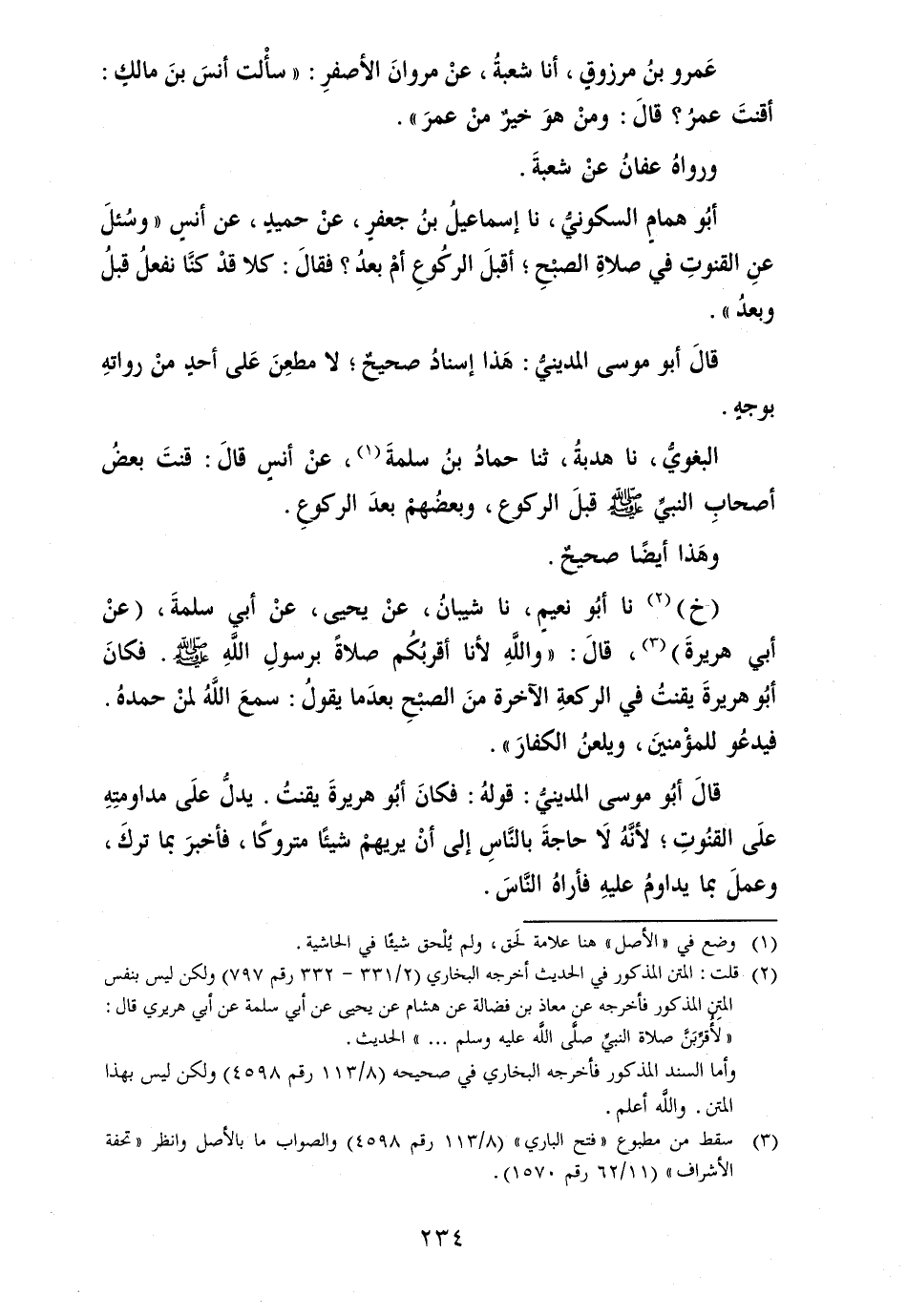 الْبَغَوِيّ، نَا هدبة، ثَنَا حَمَّاد بن سلمةَ، عَن أنس قالَ: قنتَ بعضُ أصحابِ النَّبِي [صلى الله عَلَيْهِ وَسلم] قبل الرُّكُوع، وبعضهمْ بعدَ الركوعِ.
