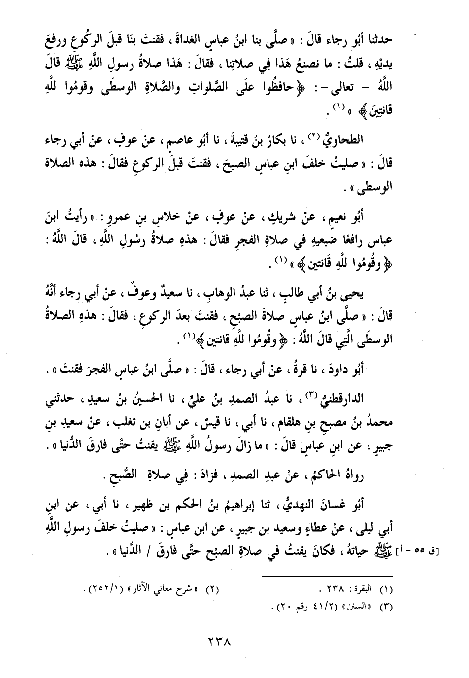 الطَّحَاوِيّ، نَا بكار بن قُتَيْبَة، نَا أَبُو عَاصِم، عَن عَوْف، عَن أبي رَجَاء قَالَ: " صليتُ خلفَ ابنِ عَبَّاس الصبحَ، فقنتَ قبل الركوعِ فَقَالَ: هَذِه الصَّلَاة الْوُسْطَى ".