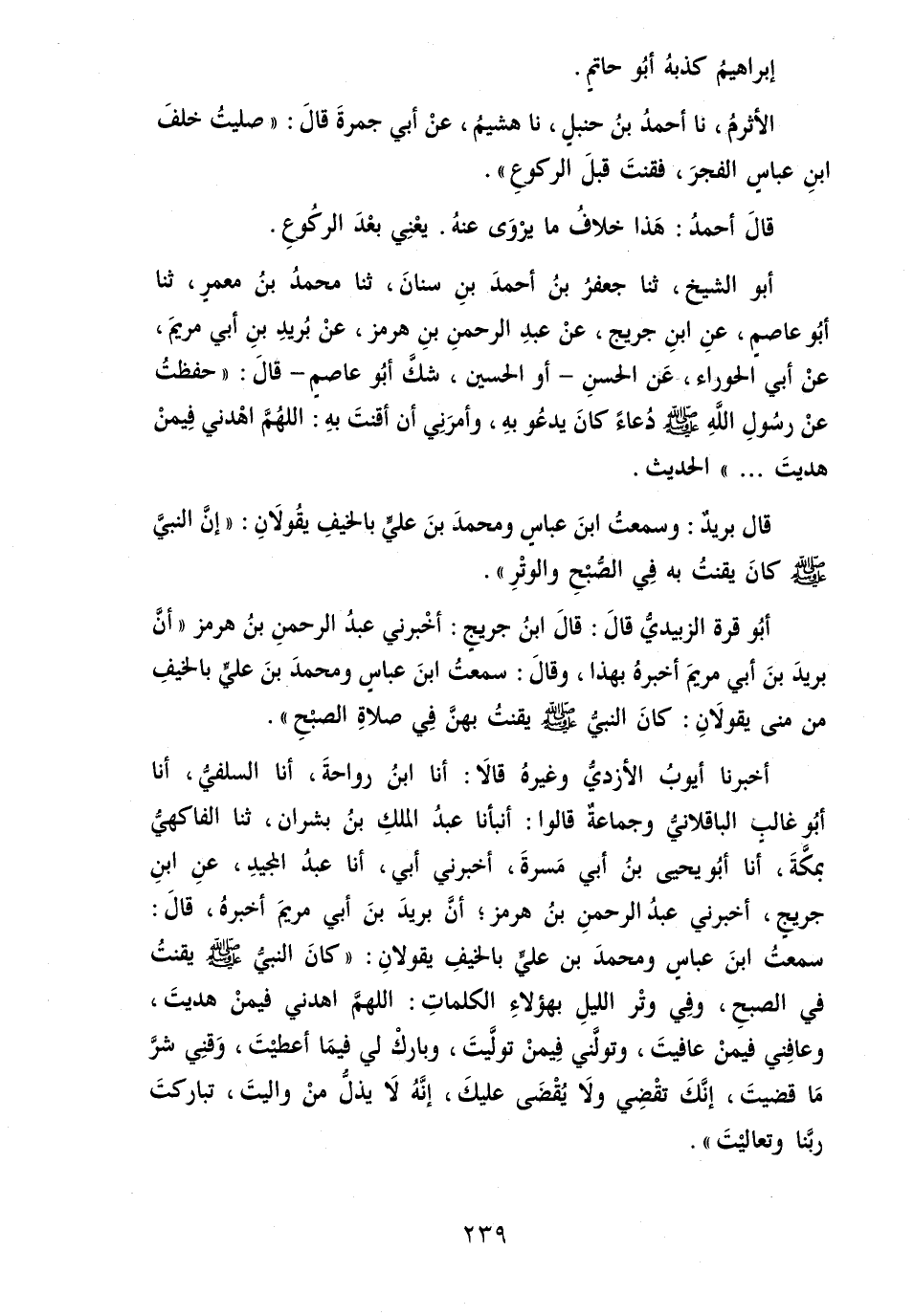 أخبرنَا أَيُّوب الْأَزْدِيّ وَغَيره قَالَا: أَنا ابْن رواحةَ، أَن السفلي، أَنا أَبُو غَالب الباقلاني وَجَمَاعَة قَالُوا: أَنبأَنَا عبد الْملك بن بَشرَان، ثَنَا الفاكهي بِمَكَّة، أَنا أَبُو يحيى بن أبي مَسَرَّة، أَخْبرنِي أبي، أَنا عبد الْمجِيد، عَن ابْن جريج، أَخْبرنِي عبد الرَّحْمَن بن هُرْمُز؛ أَن بريد بن أبي مَرْيَم أخبرهُ، قَالَ: سَمِعت ابْن عَبَّاس وَمُحَمّد بن عَليّ بالخيف يَقُولَانِ: " كانَ النَّبِي [صلى الله عَلَيْهِ وَسلم] يقنتُ فِي الصبحِ، وَفِي وتر الليلِ بهؤلاء الْكَلِمَات: اللهمَّ اهدني فِيمَن هديتَ، وعافِني فِيمَن عافيتَ، وتولَّني فمينْ توليتَ، وباركْ لي فيمَا أعطيتَ، وقِني شرَّ مَا قضيتَ، إنكَ تقضي وَلَا يقْضى عليكَ، إِنَّه لَا يذل منْ واليتَ، تباركتَ رَبنَا وتعاليتَ ".