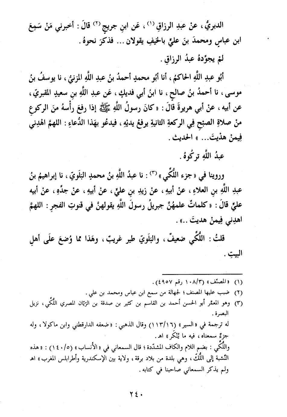 وروينا فِي " جُزْء اللكي ": نَا عبد الله بن مُحَمَّد البلوي، نَا إِبْرَاهِيم بن عبد الله بن الْعَلَاء، عَن أَبِيه، عَن زيد بن عَليّ، عَن أَبِيه، عَن جده، عَن أَبِيه عَليّ قَالَ: " كَلِمَات علمهن جِبْرِيل رسولَ الله يقولهن فِي قنوت الْفجْر: اللَّهُمَّ اهدني فِيمَن هديتَ ... ".