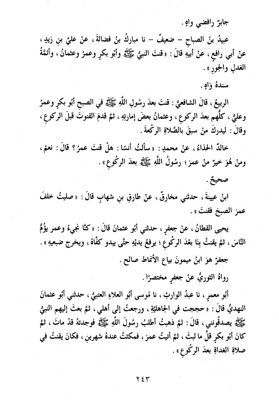 عبيد بن الصَّباح - ضَعِيف - نَا مبارك بن فضَالة، عَن عَليّ بن زيد، عَن أبي رَافع، عَن أَبِيه قَالَ: " قنتَ النَّبِي [صلى الله عَلَيْهِ وَسلم] وَأَبُو بكرٍ وعمرُ وعثمانُ، وأئمةُ العدلِ والجورِ ".