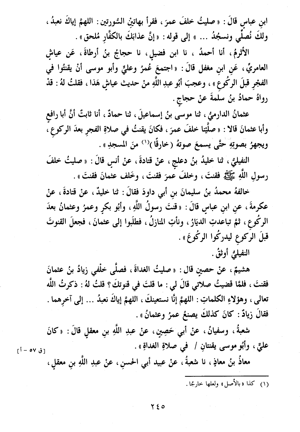 عُثْمَان الدَّارمِيّ، ثَنَا مُوسَى بن إِسْمَاعِيل، ثَنَا حَمَّاد، أَنا ثَابت أَن أَبَا رافعٍ وَأَبا عُثْمَان قَالَا: " صلينَا خلف عمر، فَكَانَ يقنتُ فِي صَلَاة الفجرِ بعد الركوعِ، ويجهر بِصَوْتِهِ حَتَّى يسمعَ صَوته (خارقاً) من الْمَسْجِد ".