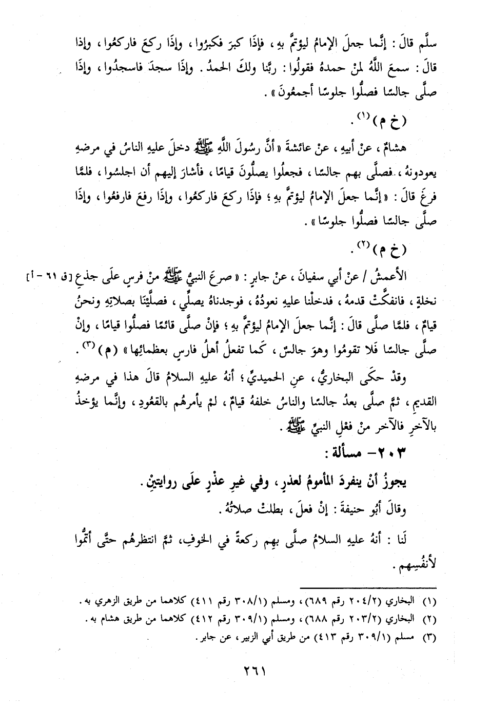 الأعمشُ [ق 61 - أ] / عَن أبي سُفْيَان، عَن جَابر: " صرعَ النَّبِي [صلى الله عَلَيْهِ وَسلم] من فرس على جذعِ نَخْلَة، فانفكت قدمه، فَدَخَلْنَا عيه نعودُهُ، فوجدناهُ يُصَلِّي، فصلينا بِصَلَاتِهِ وَنحن قيام، فَلَمَّا صلى قَالَ: إِنَّمَا جعل الإِمَام ليؤتم بِهِ، فَإِن صلى قائماُ فصلوا قيَاما، وَإِن صلى جالساُ فَلَا تقومُوا وَهُوَ جالسٌ، كَمَا تفعلُ أهلُ فَارس بعظمائِها " (م) .
