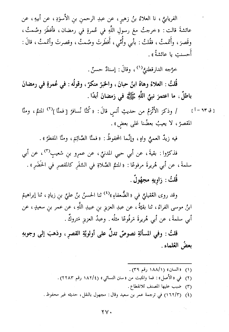 قُلتُ: العلاءُ وهاهُ ابنُ حبانَ، والخبرُ منكرٌ، وقولُه: فِي عُمرةٍ فِي رمضانَ باطلٌ، مَا اعتمرَ نبيُّ اللهِ [صلى الله عَلَيْهِ وَسلم] فِي رَمضانَ أبدا.
