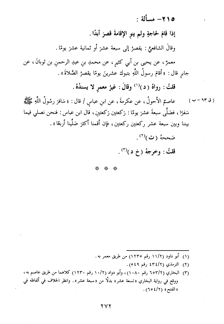 عاصمٌ الأحولُ، عَن عكرمةَ، عَن ابْن عباسٍ [ق 63 - ب] / قَالَ: " سَافرَ رسولُ الله [صلى الله عَلَيْهِ وَسلم] سَفراً، فصلى سبعةَ عشرَ يَوْمًا: رَكعتين رَكعتين، قَالَ ابْن عَبَّاس: فَنحْن نصلي فِيمَا بَيْننَا وَبَين سَبْعَة عشر رَكْعَتَيْنِ رَكْعَتَيْنِ، فَإِن أَقَمْنَا أكثرَ صَلَّينا أَرْبعا ".