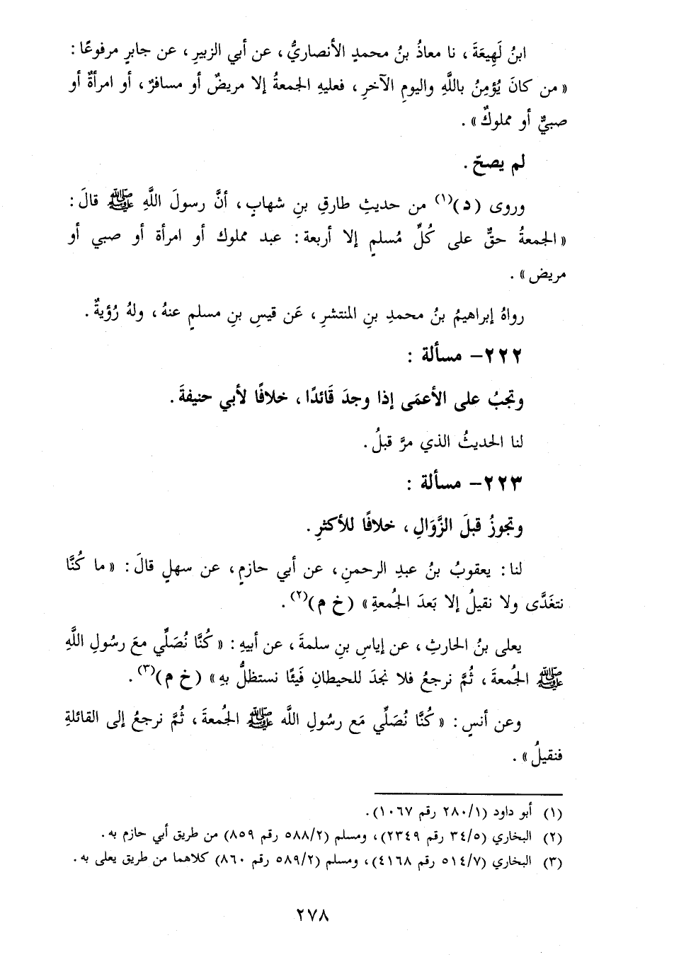 وروى (د) من حَدِيث طَارق بن شهابٍ، أَن رسولَ الله [صلى الله عَلَيْهِ وَسلم] قالَ: " الجمعةُ حقٌّ على كُلِّ مُسلمٍ إِلَّا أَرْبَعَة: عبد مَمْلُوك أَو امْرَأَة أَو صبي أَو مَرِيض ".