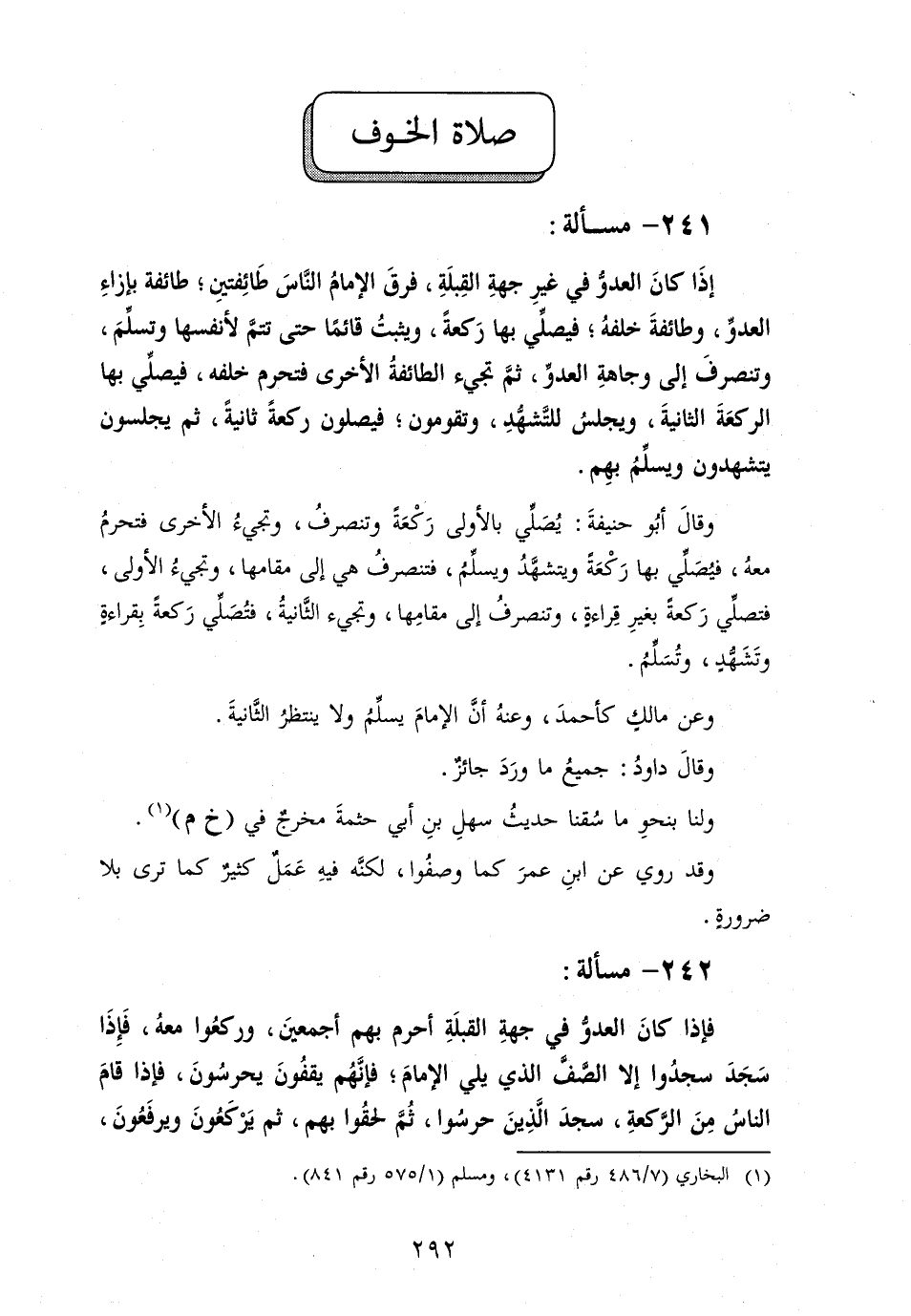 إذَا كانَ العدوُّ فِي غيرِ جهةِ القِبلَةِ، فرقَ الإمامُ النَّاسَ طَائِفتينِ؛ طَائِفَة بإزاءِ العدوِّ، وطائفةَ خلفهُ؛ فيصلِّي بهَا رَكعةً، ويثبتُ قَائِما حَتَّى تتمَّ لأنفسها وتسلِّمَ، وتنصرفَ إِلَى وجاهةِ العدوِّ، ثمَّ تَجِيء الطائفةُ الْأُخْرَى فَتحرم خَلفه، فيصلِّي بهَا الركعةَ الثانيةَ، ويجلسُ للتَّشهُّدِ، وتقومون؛ فيصلون رَكْعَة ثَانِيَة، ثمَّ يَجْلِسُونَ يتشهدون ويسلِّمُ بهِم.