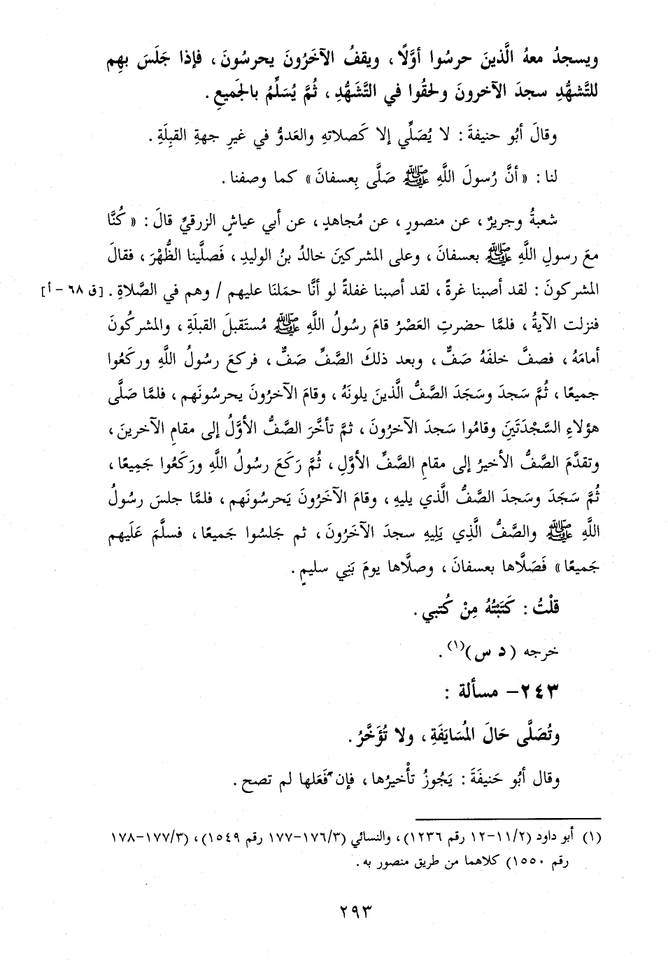 ويسجدُ معهُ الَّذين حرسُوا أوَّلاً، ويقفُ الآخَرُونَ يحرسُونَ، فَإِذا جَلَسَ بهِم للتَّشهُّدِ سجدَ الآخرونَ ولحقُوا فِي التَّشَهُّدِ، ثُمَّ يُسَلِّمُ بالجَميعِ.