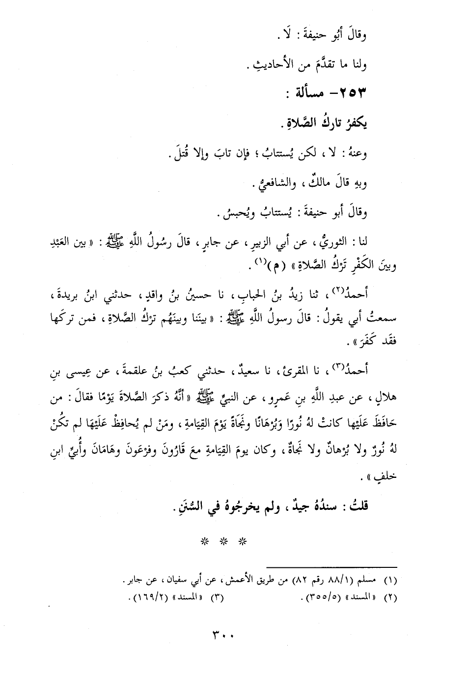 أَحْمد، ثَنَا زيد بن الْحباب، نَا حُسَيْن بن وَاقد، حَدثنِي ابْن بُرَيْدَة، سمعتُ أبي قَول: قَالَ رسولُ الله [صلى الله عَلَيْهِ وَسلم] : " بينَنا وبينُهم ترْكُ الصَّلاةِ، فَمن تركَها فقَد كَفَرَ ".