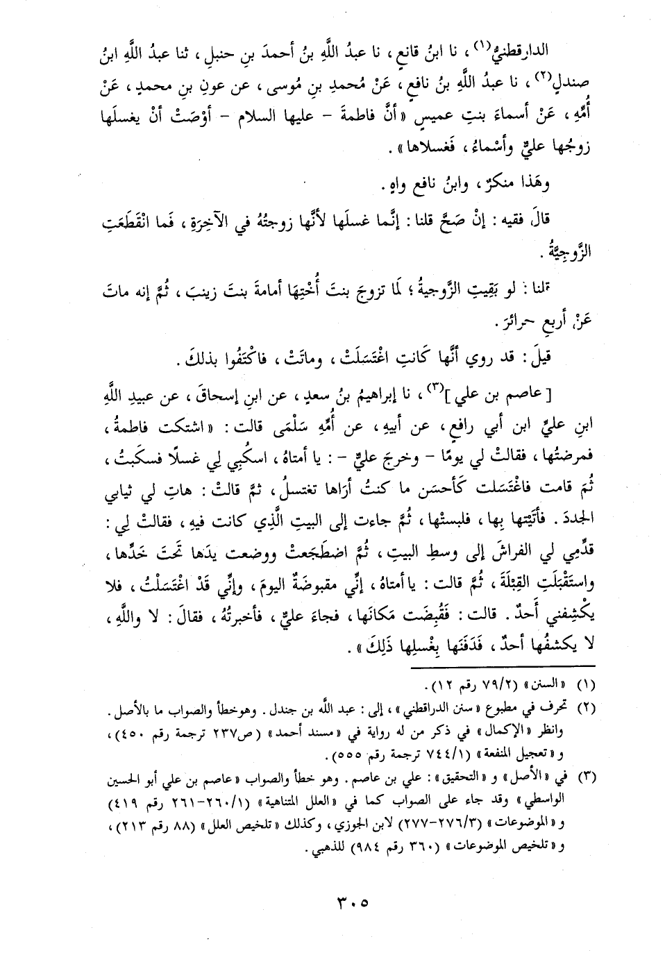 الدارقطنيُّ، نَا ابْن قَانِع، نَا عبد الله بن أَحْمد بن حَنْبَل، ثَنَا عبد الله ابْن صندل، نَا عبد الله بن نَافِع، عَن مُحَمَّد بن مُوسَى، عَن عون بن مُحَمَّد، عَن أمه، عَن أَسمَاء بنت عُمَيْس " أَن فَاطِمَة - عَلَيْهَا السَّلَام - أوصتْ أَن يغسلَها زَوجهَا عَليّ وأسماءُ، فغسلاها ".