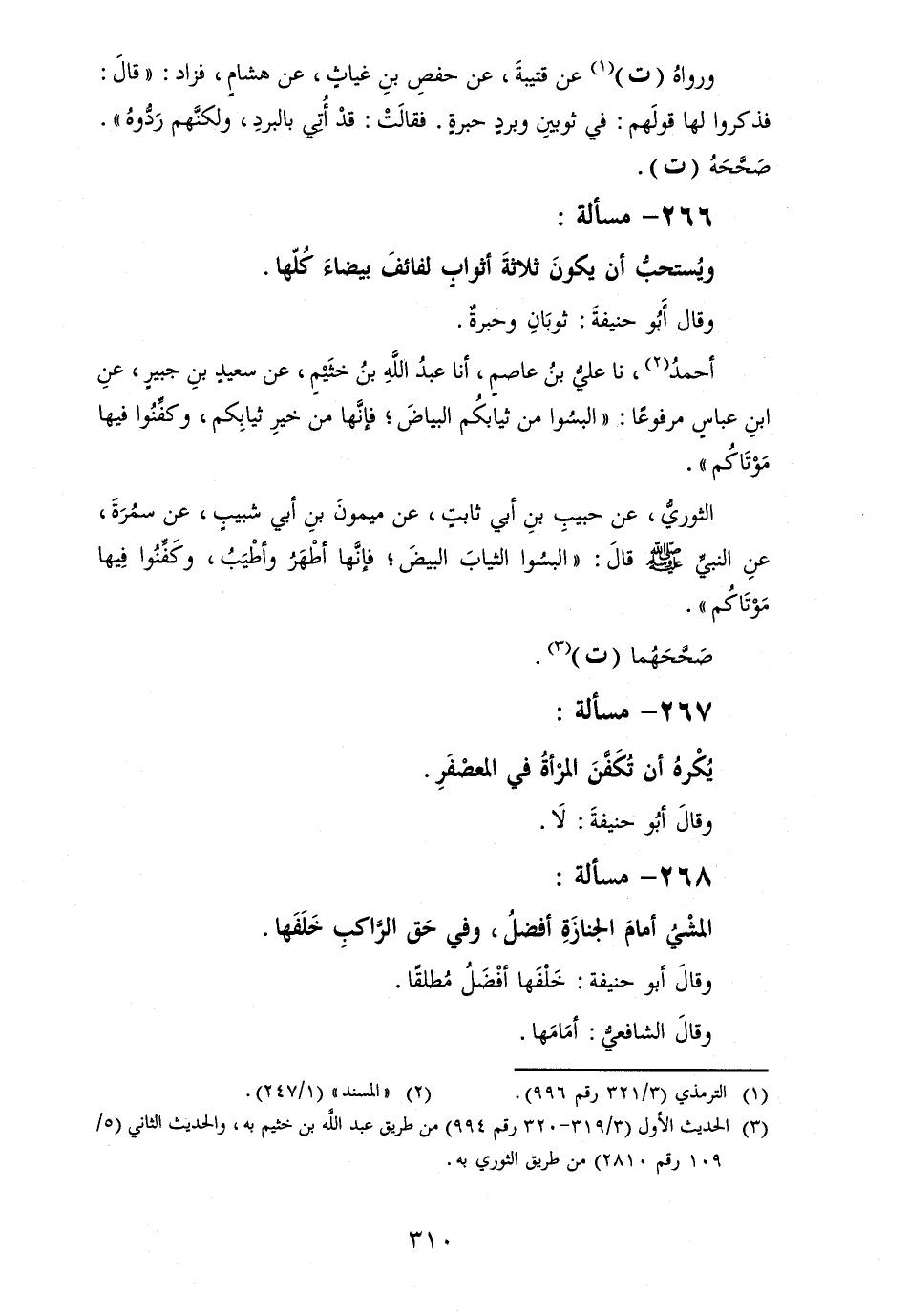 ويُستحبُّ أَن يكونَ ثلاثةَ أثوابٍ لفائفَ بيضاءَ كُلّها.