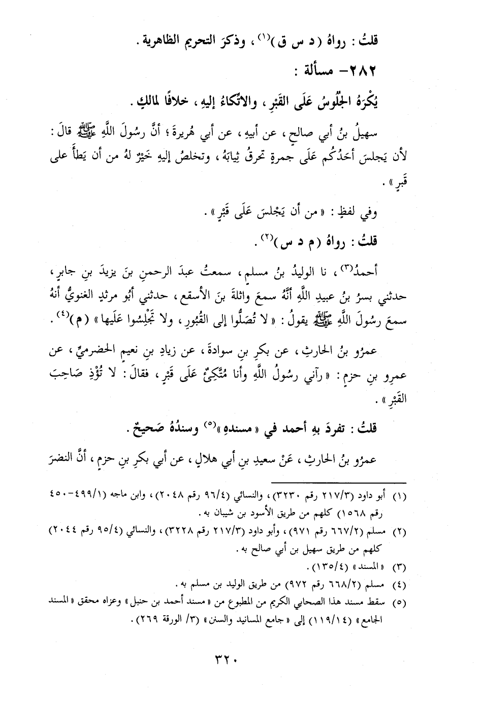 عَمْرو بن الحارثِ، عَن بكر بن سوادةَ، عَن زِيَاد بن نعيم الْحَضْرَمِيّ، عَن عَمْرو بن حزم: " رَآنِي رسولُ اللهِ وَأَنا مُتَّكِئ على قبرٍ، فقالَ: لَا تؤذ صَاحب القبرِ ".