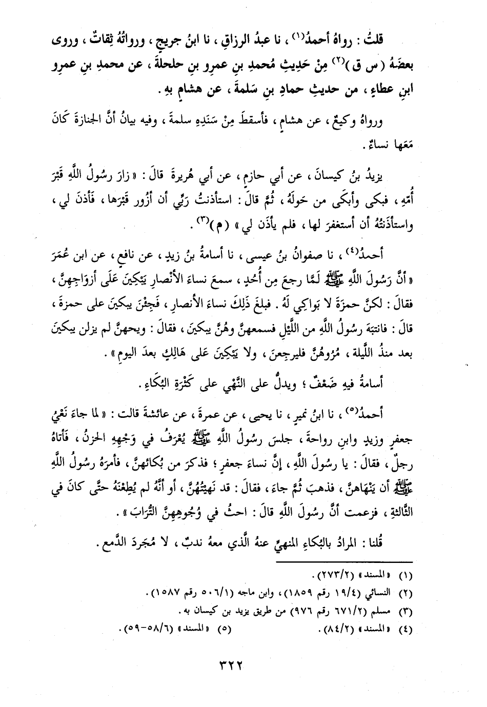أحمدُ، نَا صَفْوَان بن عِيسَى، نَا أُسَامَة بن زيد، عَن نَافِع، عَن ابْن عمرَ " أَن رسولَ اللهِ [صلى الله عَلَيْهِ وَسلم] لما رجعَ من أُحدٍ، سمعَ نساءَ الْأَنْصَار يبْكين على أَزوَاجهنَّ، فَقَالَ: لَكِن حمزةَ لَا بواكي لَهُ. فَبلغ ذَلِك نسَاء الْأَنْصَار، فجئن يبْكين على حَمْزَة، قَالَ: فانتبهَ رسولُ اللهِ من الليلِ فسمعهن وَهن يبكينَ، فَقَالَ: ويحهن لم يزلن يبْكين بعد مُنْذُ اللَّيْلَة، مروهن فليرجعنَ، وَلَا يبْكين على هَالك بعد الْيَوْم ".