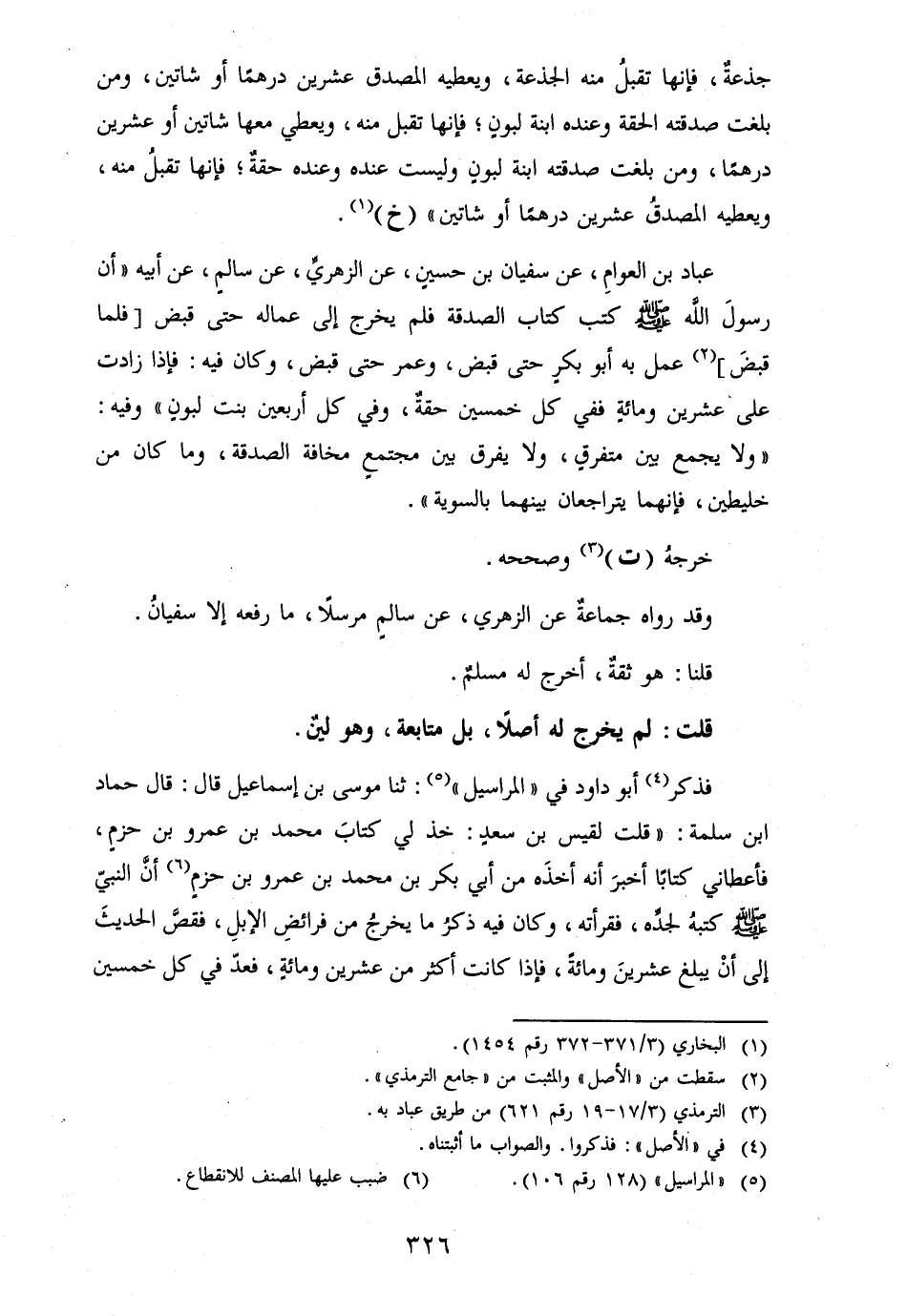 عباد بن الْعَوام، عَن سُفْيَان بن حُسَيْن، عَن الزُّهْرِيّ، عَن سَالم، عَن أَبِيه " أَن رسولَ الله [صلى الله عَلَيْهِ وَسلم] كتب كتاب الصَّدَقَة فَلم يخرج إِلَى عماله حَتَّى قبض [فَلَمَّا قبضَ] عمل بِهِ أَبُو بكرٍ حَتَّى قبض، وَعمر حَتَّى قبض، وَكَانَ فِيهِ: فَإِذا زَادَت على عشْرين ومائةٍ فَفِي كل خمسين حقةٌ، وَفِي كل أَرْبَعِينَ بنت لبونٍ " وَفِيه: " وَلَا يجمع بَين متفرقٍ، وَلَا يفرق بَين مجتمعٍ مَخَافَة الصَّدَقَة، وَمَا كَانَ من خليطين، فَإِنَّهُمَا يتراجعان بَينهمَا بِالسَّوِيَّةِ ".