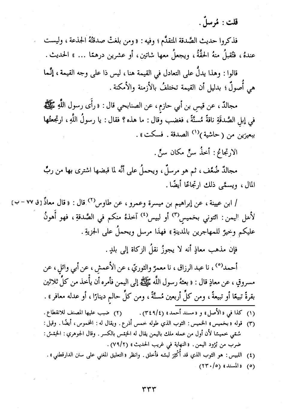 أَحْمد، نَا عبد الرَّزَّاق، نَا معمر وَالثَّوْري، عَن الْأَعْمَش، عَن أبي وَائِل، عَن مَسْرُوق، عَن معَاذ قَالَ: " بعثهُ رَسُول الله [صلى الله عَلَيْهِ وَسلم] إِلَى الْيمن فَأمره أَن يأْخذ من كلِّ ثَلَاثِينَ بقرة تبيعاً أَو تبيعةً، وَمن كلِّ أَرْبَعِينَ مُسنَّةً، وَمن كلِّ حالمٍ دِينَارا، أَو عدله معافر ".
