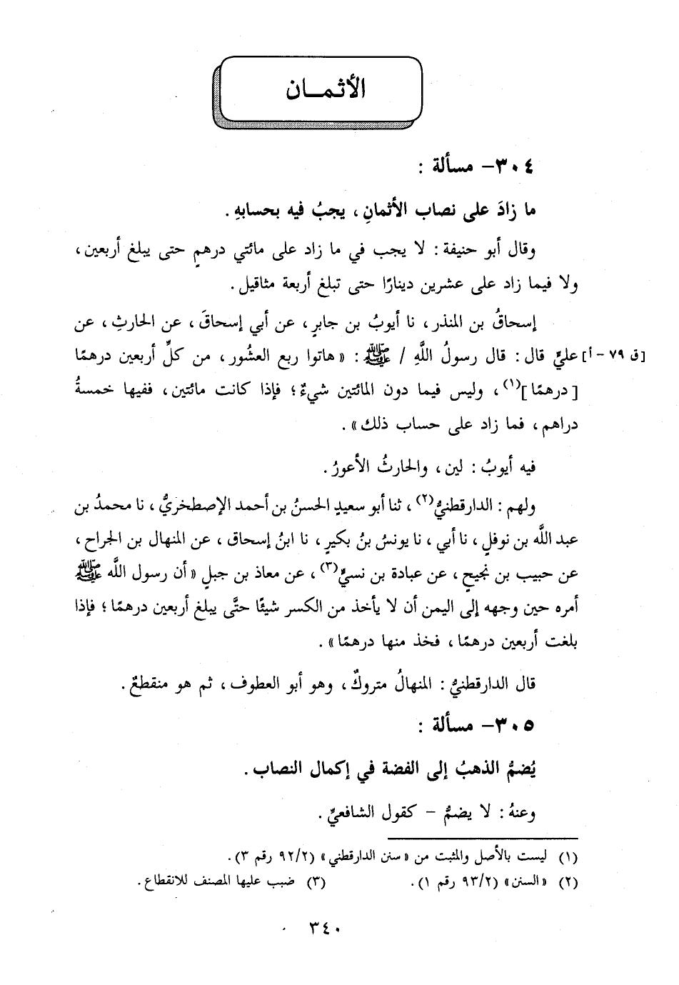 وَلَهُم: الدارقطنيُّ، ثَنَا أَبُو سعيد الحسنُ بن أَحْمد الإصطخريُّ، نَا مُحَمَّد بن عبد الله بن نَوْفَل، نَا أبي، نَا يُونُس بن بكير، نَا ابْن إِسْحَاق، عَن الْمنْهَال بن الْجراح، عَن حبيب بن نجيح، عَن عبَادَة بن نسيٍّ، عَن معَاذ بن جبل " أَن رَسُول الله [صلى الله عَلَيْهِ وَسلم] أمره حِين وَجهه إِلَى الْيمن أَن لَا يَأْخُذ من الْكسر شَيْئا حتَّى يبلغ أَرْبَعِينَ درهما؛ فَإِذا بلغت أَرْبَعِينَ درهما، فَخذ مِنْهَا درهما ".