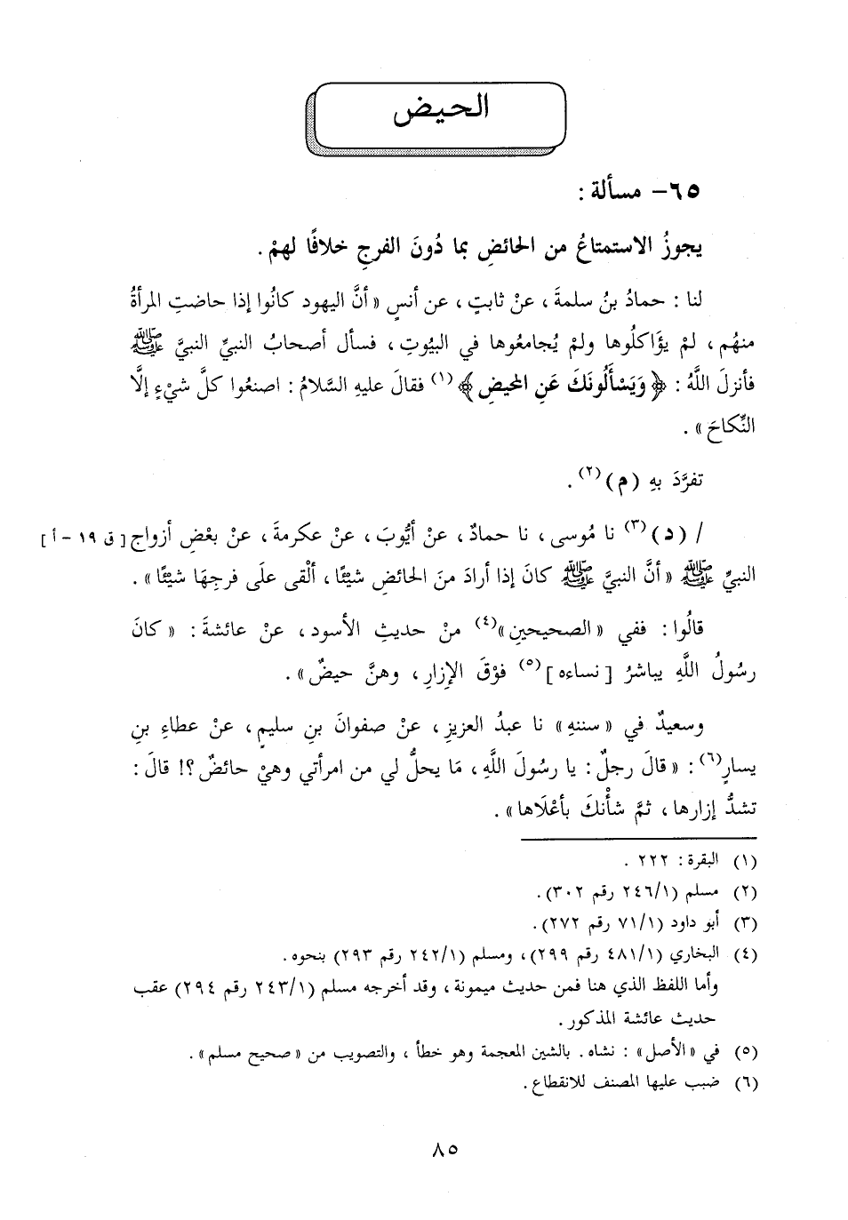 لنا: حمادُ بنُ سلمةَ، عَن ثابتٍ، عَن أنسٍ " أنّ الْيَهُود كَانُوا إِذا حَاضَت المرأةُ مِنْهُم، لم يؤاكلوها وَلم يجامعوها فِي الْبيُوت، فَسَأَلَ أَصْحَاب النبيِّ النبيَّ [صلى الله عَلَيْهِ وَسلم] فَأنْزل اللهُ: {وَيَسْأَلُونَكَ عَنِ المحيضِ) فَقَالَ [صلى الله عَلَيْهِ وَسلم] : اصنعُوا كلَّ شَيْء إِلَّا النٍّ كاحَ ".