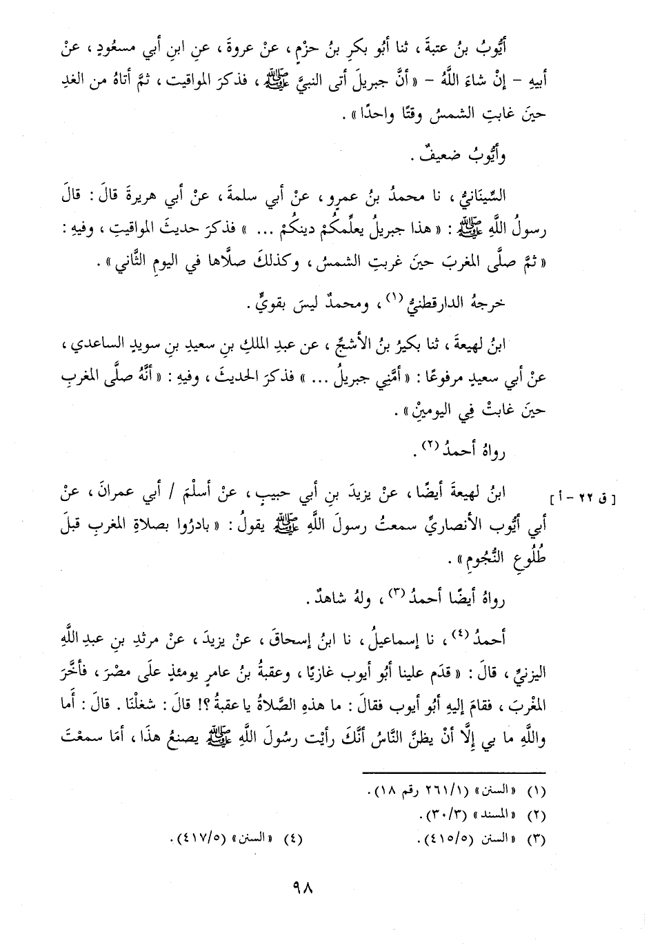 أَحْمد، نَا إِسْمَاعِيل، نَا ابْن إِسْحَاق، عَن يزِيد، عَن مرْثَد بن عبد الله الْيَزنِي، قَالَ: " قدم علينا أَبُو أَيُّوب غازياً، وَعقبَة بن عَامر يَوْمئِذٍ على مصر، فَأخر الْمغرب، فَقَامَ إِلَيْهِ أَبُو أَيُّوب فَقَالَ: مَا هَذِه الصَّلَاة يَا عقبَة؟ قَالَ: شغلنا. قَالَ: أما وَالله مَا بِي إِلَّا أَن يظنّ النَّاس أَنَّك رَأَيْت رَسُول الله [صلى الله عَلَيْهِ وَسلم] يصنع هَذَا، أما سَمِعت