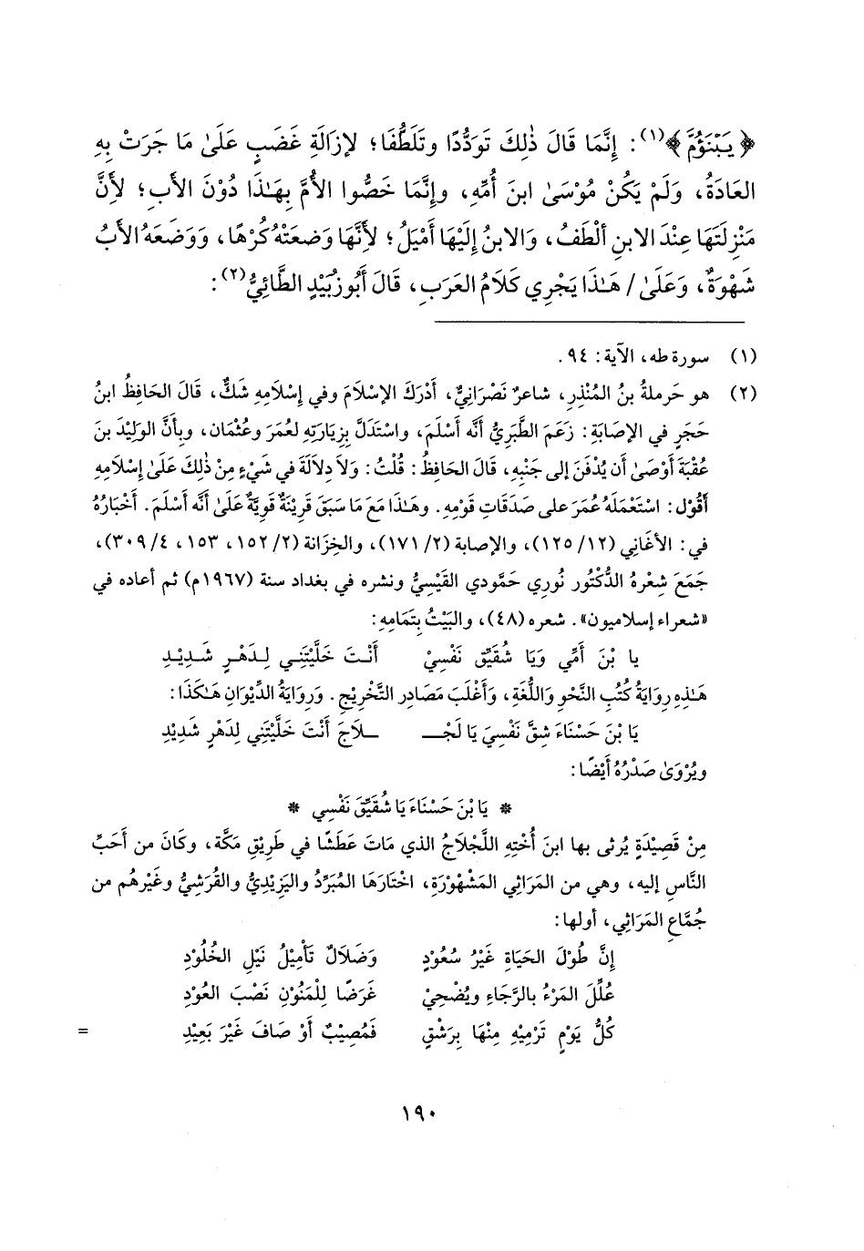 {يَبْنَؤُمَ} (¬1): إِنَّمَا قَال ذلِكَ تَوَدُّدًا وتَلَطُّفًا؛ لإزَالةِ غَضَبِ عَلَى مَا جَرَتْ بهِ العَادَةُ، وَلم يَكُنْ مُوْسَى ابنَ أُمِّهِ، وإِنَّمَا خَصُّوا الأمَّ بِهذَا دُوْنَ الأبِ؛ لأنَّ مَنْزِلَتها عِنْدَ الابنِ ألْطَفُ، وَالابنُ إِلَيها أَميَلُ؛ لأنَّها وَضعَتْهُ كُرهًا، وَوَضَعَهُ الأبُ شَهْوَةٌ، وَعَلَى هذَا يَجْرِي كَلامُ العَرَبِ، قَال أَبُو زبيدٍ الطَّائِيُّ (¬2):