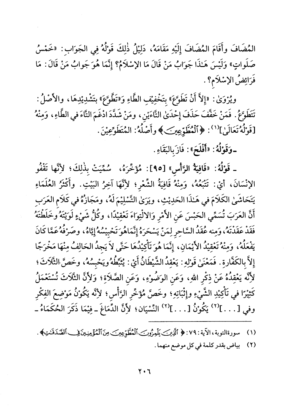 - قَوْلُهُ: "قَافِيَةُ الرَّأسِ" [95]: مُؤَخِّرَهُ، سُمِّيَتْ بِذلِكَ؛ لأنَّها تَقْفُو الإنْسَانَ، أي: تَتْبَعُهُ، وَمِنْهُ قَافِيَةُ الشِّعْرِ؛ لأنَّهَا آخِرُ البَيتِ. وأَكْثَرُ العُلَمَاءِ يَتَحَاشَى الكَلامَ في هَذَا الحَدِيثِ، ويَرَى التَّسْلِيمَ لَهُ، ومَجَازُهُ في كَلامِ العَرَبِ أَنَّ العَرَبَ تُسَمِّي الحَبْسَ عَنِ الأمْرِ وَالالْتِوَاءَ تَعْقِيدًا، وكُلُّ شَيءٍ لَوَيتَهُ وخَلَطْتَهُ فَقَدْ عَقَدْتَهُ، وَمِنه عُقَدُ السَّاحِرِ لِمَنْ يَسْحَرَهُ إِنَّمَا هُوَ تَحْبِيسُهُ إِيَّاهُ، وصَرْفُهُ عَمَّا كَانَ يَفْعَلُهُ، وَمِنْهُ تَعْقِيدُ الأيمَانِ، إِنَّمَا هُوَ تَأْكِيدُهَا حَتَّى لَا يَجِدُ الحَالِفُ مِنْهَا مَخْرَجًا إِلَّا بِالكَفَّارةِ. فَمَعْنَى قَوْلهِ: يَعْقِدُ الشَّيطَانُ أَي: يُثَبِّطُهُ ويَحْبِسُهُ، وخَصَّ الثَّلاثَ؛ لأنَّه يَعْقِدُهُ عَنْ ذِكْرِ اللهِ، وَعَنِ الوَضُوْءِ، وَعَنِ الصَّلاةِ؛ وَلأنَّ الثَّلاثَ تُسْتَعْمَلُ كَثِيرًا في تأْكِيدِ الشَّيءِ وإِثْبَاتِهِ؛ وخَصَّ مُؤَخِّرِ الرَّأْسِ؛ لأنَّه يَكُوْنُ مَوْضِعَ الفِكْرِ وفي [ ... ] (2) يَكُوْنُ [ ... ] (¬2) النِّسْيَان؛ لِأَنَّ الدِّمَاغَ -فِيمَا ذَكَرَ الحُكَمَاءُ-