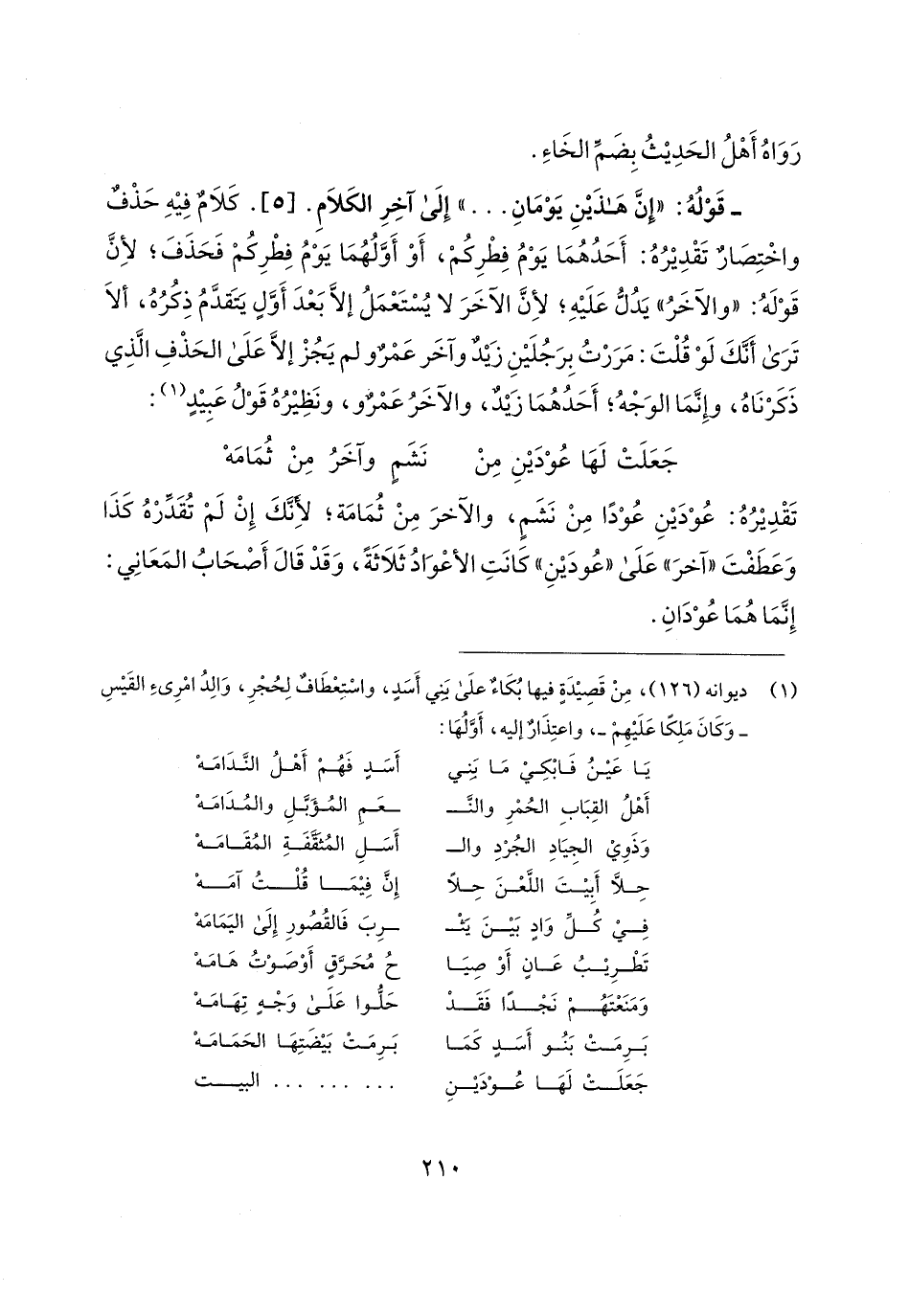 - قَوْلُهُ: "إِنَّ هَذَينِ يَوْمَانِ ... " إِلَى آخِرِ الكَلامِ. [5]. كَلامٌ فِيهِ حَذْفٌ واخْتِصَارٌ تَقْدِيرُهُ: أَحَدُهُمَا يَوْمُ فِطْرِكُمْ، أَوْ أَوَّلُهُمَا يَوْمُ فِطْرِكُمْ فَحَذَفَ؛ لأنَّ قَوْلَهُ: "والآخَرُ" يَدُلُّ عَلَيهِ؛ لأنَّ الآخَرَ لا يُسْتَعْمَلُ إلَّا بَعْدَ أَوَّلٍ يَتَقدَّمُ ذِكُرُهُ، ألا تَرَى أَنَّكَ لَوْ قُلْتَ: مَرَرْتُ بِرَجُلَينِ زَيدٌ وآخَر عَمْرٌ ولم يَجُزْ إلَّا عَلَى الحَذْفِ الَّذِي ذَكَرْنَاهُ، وإِنَّمَا الوَجْهُ؛ أَحَدُهُمَا زَيدٌ، والآخَرُ عَمْرٌو، ونَظِيرُهُ قَوْلُ عَبِيدٍ (¬1):
