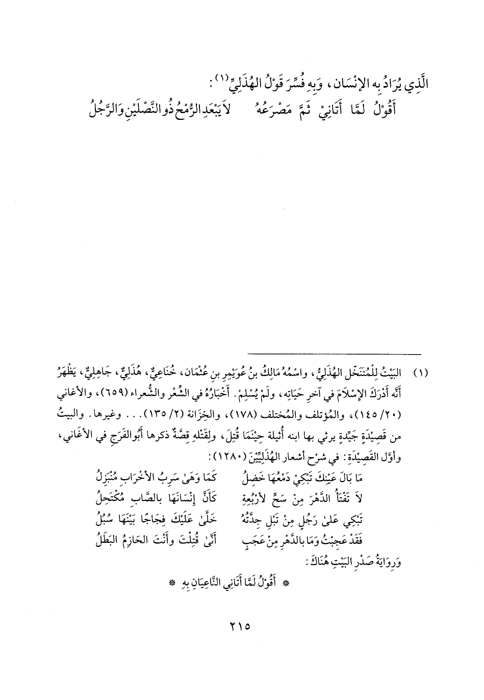 (¬1) البَيتُ لِلْمُتَنَخّل الهُذَلِيُّ، واسْمُهُ مَالِكُ بنُ عُوَيمِرِ بنِ عُثْمَان، خُنَاعِيٌّ، هُذَلِيٌّ، جَاهِلِيٌّ، يَظْهَرُ أَنَّه أَدْرَكَ الإِسْلامَ في آخرِ حَيَاتِه، ولَمْ يُسْلِمْ. أَخْبَارُهُ في الشِّعْر والشُّعراء (659)، والأغاني (20/ 145)، والمُؤتلف والمُختلف (178)، والخِزَانة (2/ 135) ... وغيرها. والبيتُ من قَصِيدَةٍ جَيِّدةٍ يرثي بها ابنه أُثيلة حِينَمَا قُتِلَ، ولِقَتْلهِ قِصَّةٌ ذكرها أَبُو الفَرَجِ في الأغَاني، وأوَّل القَصِيدَةِ: في شرْح أشعار الهُذَلِيِّينَ (1280):