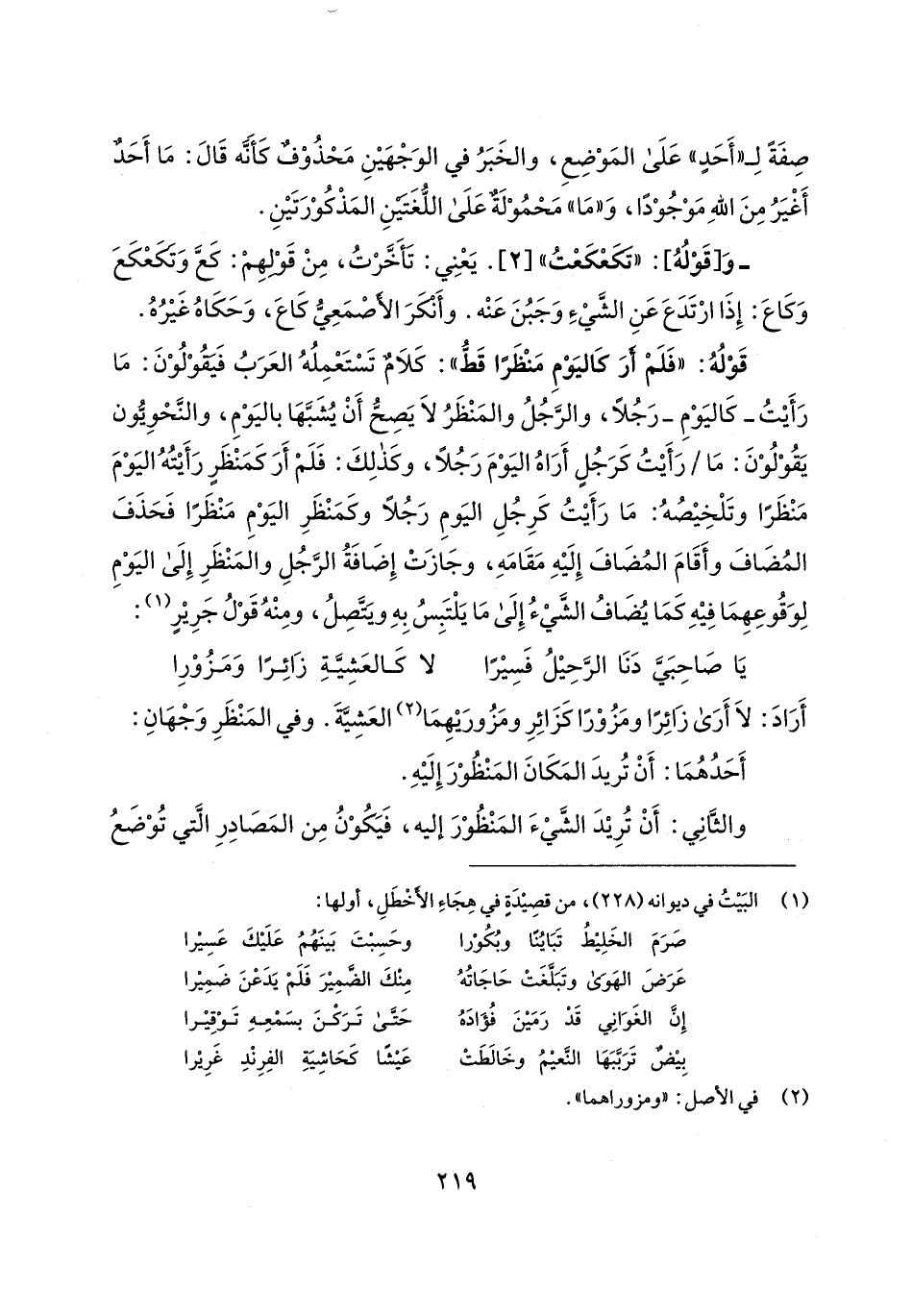 أَرَادَ: لَا أَرَى زَائِرًا ومَزُوْرًا كَزَائِرِ ومَزُورَيهِمَا (¬2) العَشِيَّةَ. وفي المَنْظَرِ وَجْهَانِ: