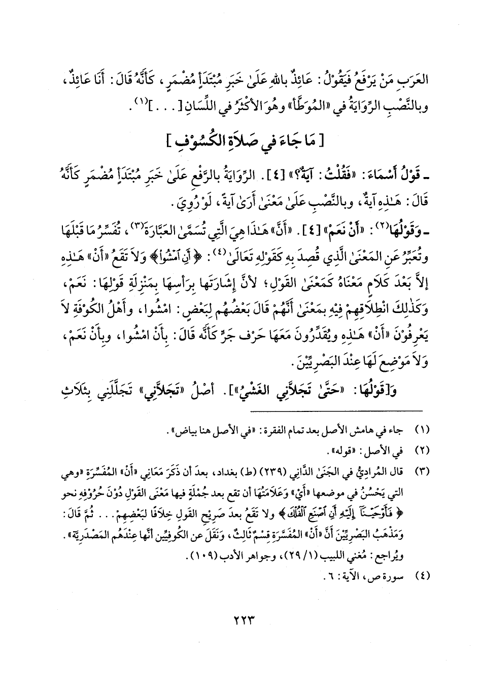 - قَوْلُ أسْمَاء: "فَقُلْتُ: آيةٌ؟ " [4]. الرِّوَايَةُ بالرَّفْعِ عَلَى خَبَرِ مُبْتَدَأٍ مُضْمَرٍ كَأَنَّهُ قَال: هَذِهِ آيةٌ، وبالنَّصْبِ عَلَى مَعْنَى أَرَى آيةً، لَوْ رُويَ.