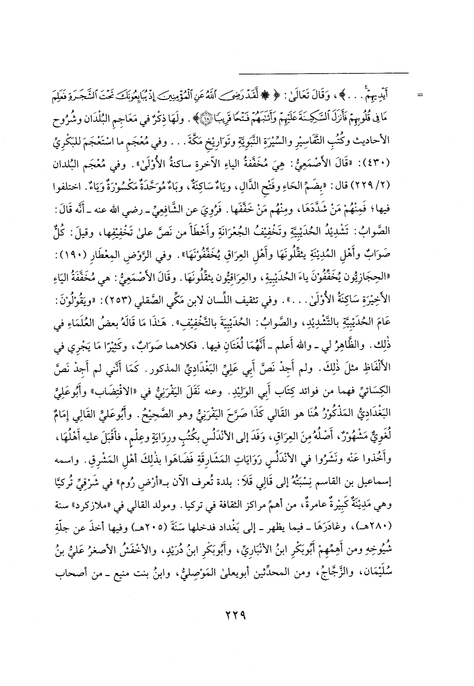 = أَيدِيهِمْ ... }، وَقَال تَعَالى: {لَقَدْ رَضِيَ اللَّهُ عَنِ الْمُؤْمِنِينَ إِذْ يُبَايِعُونَكَ تَحْتَ الشَّجَرَةِ فَعَلِمَ مَا فِي قُلُوبِهِمْ فَأَنْزَلَ السَّكِينَةَ عَلَيهِمْ وَأَثَابَهُمْ فَتْحًا قَرِيبًا}. ولَهَا ذِكْرٌ في مَعَاجِمِ البُلْدَان وشُرُوح الأحاديث وكُتُبِ التَّفَاسِيرِ والسِّيرَةِ النَّبَويَّةِ وتَوَارِيخِ مَكَّةَ ... وفي مُعْجَمِ ما اسْتَعْجَمَ للبَكْرِيِّ (430): "قَال الأصْمَعِيُّ: هِيَ مُخَفَّفةُ الياءِ الآخرةِ ساكنةُ الأُوْلَى". وفي مُعْجَم البُلدان (2/ 229) قال: "بِضَمِّ الحَاءِ وفَتْحِ الدَّالِ، ويَاءٌ سَاكِنَةٌ، وبَاءٌ مُوَحَّدَةٌ مَكْسُوْرَةٌ وَيَاءٌ. اختلفوا فيها؛ فَمِنْهُمْ مَنْ شَدَّدَهَا، ومِنْهُم مَنْ خَفَّفَها. فَرُويَ عن الشَّافِعِيِّ - رضي الله عنه - أَنَّه قَال: الصَّوابُ: تَشْدِيدُ الحُدَيبِيّةِ وتَخْفِيفُ الجُعْرَانَةِ وأَخْطَأَ من نَصَّ على تَخْفِيفِها، وقيلَ: كُلٌّ صَوَابٌ وأَهْلِ المُدِينَةِ يثقِّلُونَهَا وأَهْلِ العِرَاقِ يُخَفِّفُوْنَهَا". وفي الرَّوْضِ المِعْطَارِ (190): "الحِجَازِيُّون يُخَفِّفُوْنَ ياءَ الحُدَيبِيةِ، والعِرَاقِيُّون يثقِّلُونَهَا. وقَال الأصْمَعِيُّ: هي مُخَفَّفَةُ اليَاءِ الأخِيرَةِ سَاكِنَةُ الأُوْلَى ... ". وفي تثقيف اللِّسان لابن مَكِّي الصَّقلي (253): "ويَقُوْلُوْنَ: عَامَ الحُدَيبِيّةِ بالتَّشْدِيدِ، والصَّوابُ: الحُدَيبِيَةَ بالتَّخْفِيفِ". هَذَا مَا قَالهُ بعضُ العُلَمَاءِ في ذلِك. والظَّاهِرُ لي -والله أَعلم- أَنهُمَا لُغَتَانِ فيها. فكلاهما صَوَابٌ، وكَثِيرًا مَا يَجْرِي في الألْفَاظِ مثلَ ذلِكَ. ولم أَجِدْ نَصَّ أَبِي عَلِيِّ البَغْدَادِيِّ المذكور. كَمَا أَنَّني لم أَجِدْ نَصَّ الكِسَائيِّ فهما من فوائد كِتَاب أَبِي الوَليدِ. وعنه نَقَلَ اليَفْرَنِيُّ في "الاقْتِضَاب" وأَبُو عَلِيٍّ البَغْدَادِيُّ المَذْكُوْرُ هُنَا هو القَالي كَذَا صَرَّحَ اليَفْرَبيُّ وهو الصَّحِيحُ. وأَبُو عَليٍّ القَالِي إِمَامٌ لُغَويٌّ مَشْهُوْرٌ، أَصْلُهُ مِنَ العِرَاقِ، وَفَدَ إلى الأنْدَلُسِ بكُتُبٍ ورِوَايَةٍ وعِلْمٍ، فأَقْبَلَ عليه أَهْلُهَا، وأَخُذوا عَنْه ونَشَرُوا في الأنْدَلُسٍ رَوَايَاتِ المَشَارِقَةِ فَضَاهَوا بذلِكَ أهْلِ المَشْرِقِ. واسمه إسماعيل بن القاسم نِسْبَتُهُ إلى قَالِي قَلا: بلدة تُعرف الآن بـ "أرْضِ رُوم" في شَرْقِيِّ تُركيَّا وهي مَدِينَةٌ كَبِيرةٌ عامرةٌ، من أهمِّ مراكز الثقافة في تركيا. ومولد القالي في "ملازكرد" سنة (280 هـ)، وغادَرَهَا -فيما يظهر- إلى بَغْداد فدخلها سَنَةَ (205 هـ) وفيها أخذَ عن جلّةِ شُيُوخِهِ ومن أَهِمِّهِمْ أَبُو بَكْرِ ابنُ الأنْبَارِيِّ، وأَبُو بكرِ بنُ دُرَيدٍ، والأخْفَشُ الأصغرُ عَليُّ بنُ سُلَيمَان، والزَّجَّاجُ، ومن المحدِّثين أبو يعلى المَوْصِليُّ، وابنُ بنت منيع -من أصحاب =