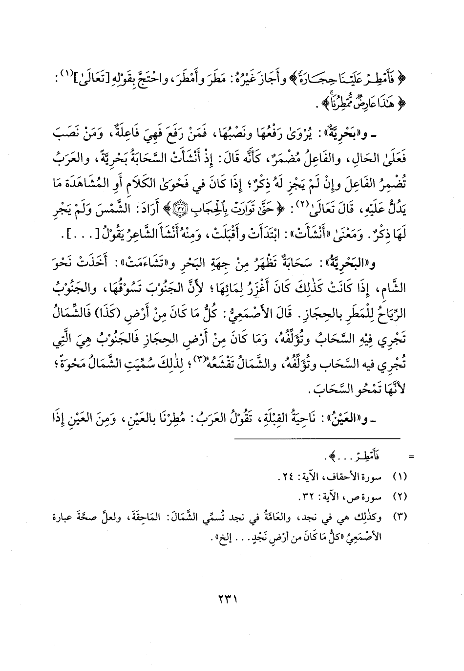 - و"بَحْرِيَّةً": يُرْوَى رَفْعُهَا ونَصْبُهَا، فَمَنْ رَفَعَ فَهِيَ فَاعِلَةٌ، وَمَنْ نَصَبَ فَعَلَى الحَالِ، والفَاعِلُ مُضْمَرٌ، كَأَنَّه قَال: إِذْ أَنْشَأَتْ السَّحَابَةُ بَحْرِيَّةً، والعَرَبُ تُضْمِرُ الفَاعِلَ وإِنْ لَمْ يَجْزِ لَهُ ذِكْرٌ؛ إِذَا كَانَ في فَحْوَى الكَلامِ أَو المُشَاهَدَة مَا يَدُلُّ عَلَيهِ، قَال تَعَالى (¬2): {حَتَّى تَوَارَتْ بِالحِجَابِ} أَرَادَ: الشَّمْسَ وَلَمْ يَجْرِ لَهَا ذِكْرٌ. وَمَعْنَى "أَنْشَأَتْ": ابْتَدَأَتْ وأَقْبَلَتْ، وَمِنْهُ أَنْشَأَ الشَّاعِرُ يَقُوْلُ [ ... ].