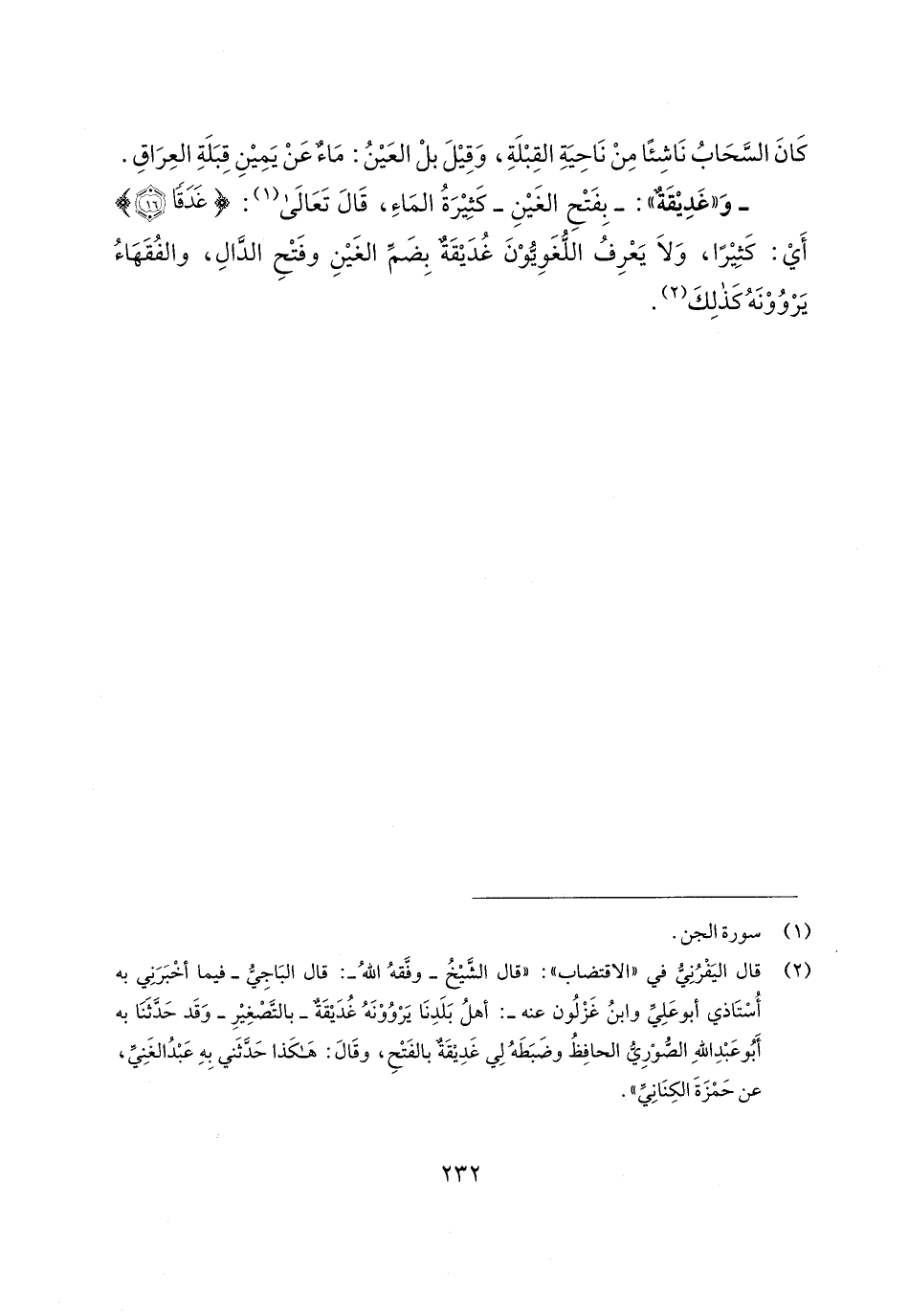 (¬2) قال اليَفْرُنِيُّ في "الاقتضاب": "قال الشَّيخُ -وفَّقهُ اللهُ-: قال البَاجِيُّ -فيما أخْبَرَنِي به أُسْتَاذي أبو عَلِيِّ وابنُ غَزْلُون عنه-: أهلُ بَلَدِنَا يَرْوُوْنَهُ غُدَيقَةٌ -بالتَّصْغِيرِ- وَقَد حَدَّثَنَا به أَبُو عَبْدِ اللهِ الصُّوْرِيُّ الحافِظُ وضَبَطَهُ لِي غَدِيقَةٌ بالفَتْحِ، وقَال: هكَذا حَدَّثَني بِهِ عَبْدُ الغَنِيِّ، عن حَمْزَةَ الكِنَانِيِّ".