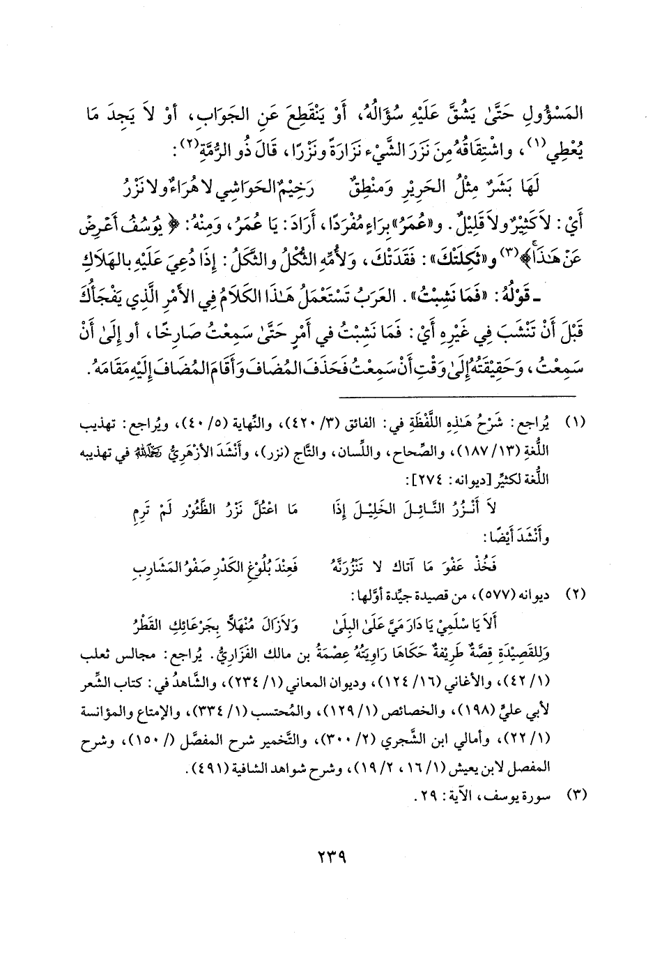 المَسْؤُولِ حَتَّى يَشُقَّ عَلَيهِ سُؤَالُهُ، أَوْ يَنْقَطِعَ عَنِ الجَوَابِ، أوْ لَا يَجِدَ مَا يُعْطِي (¬1)، واشْتِقَاقُهُ مِنَ نزَرَ الشَّيء نزَارَةً ونزْرًا، قَال ذُو الرُّمَّةِ (¬2):