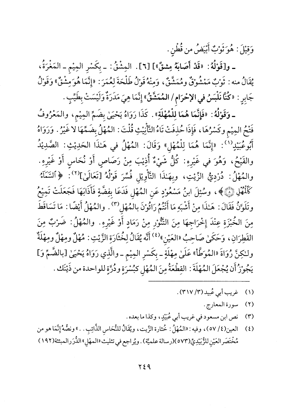 (¬4) العين (4/ 57)، وفيه: "المُهْلُ: خُثارة الزَّيت، ويُقَالُ للنُّحَاسِ الذَّائِبِ .. " ونصُّهُ إِنَّمَا هو من مُخْتَصَر العَينِ للزُّبَيدِيِّ (573) (رسالة علميَّة). ويُراجع في تثليث "المهْلِ" الدُّرَر المبثثة (192).
