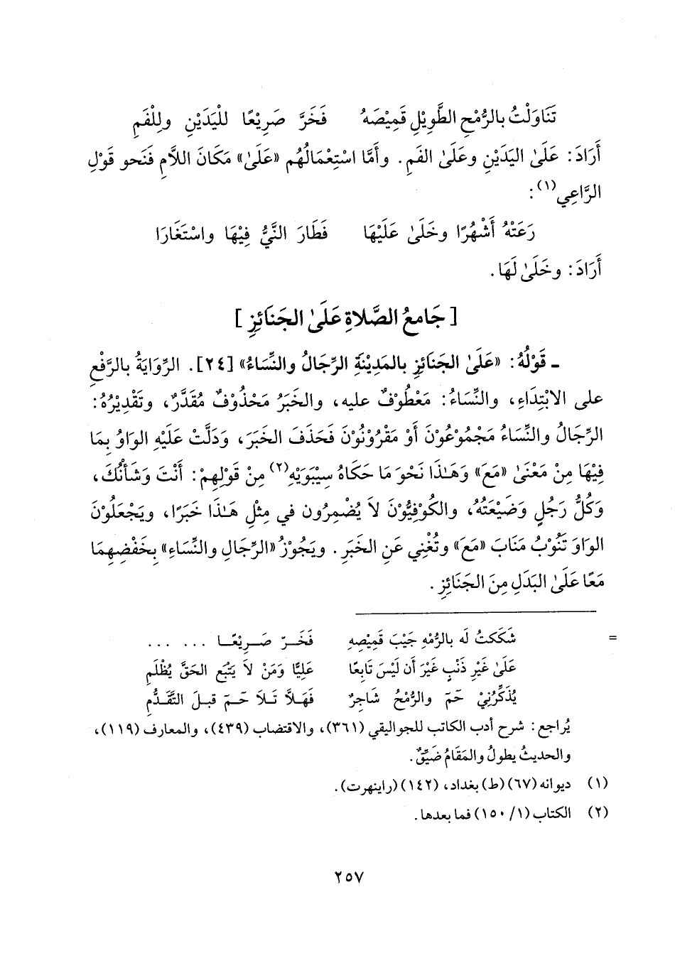 - قَوْلُهُ: "عَلَى الجَنَائزِ بالمَدِينَةِ الرِّجَالُ والنِّسَاءُ" [24]. الرِّوَايَةُ بالرَّفع على الابْتِدَاءِ، والنِّسَاءُ: مَعْطُوْفٌ عليه، والخَبَرُ مَحْذُوْفٌ مُقَدَّرٌ، وتَقْدِيرُهُ: الرِّجَالُ والنَّسَاءُ مَجْمُوْعُوْنَ أَوْ مَقْرُوْنُوْنَ فَحَذَفَ الخَبَرَ، وَدَلَّتْ عَلَيهِ الوَاوُ بِمَا فِيهَا مِنْ مَعْنَى "مَعَ" وَهَذَا نَحْوَ مَا حَكَاهُ سِيبَوَيهِ (¬2) مِنْ قَوْلهِمْ: أَنْتَ وَشَأْنُكَ، وَكُلُّ رَجُلٍ وَضَيعَتُهُ، والكُوْفِيُّوْنَ لَا يُضْمِرُون في مِثْلِ هَذَا خَبَرًا، ويَجْعَلُوْنَ الوَاوَ تنُوْبُ مَنَابَ "مَعَ" وتُغْنِي عَنِ الخَبَرِ. ويَجُوْزُ "الرّجَالِ والنِّسَاءِ" بِخَفْضِهِمَا مَعًا عَلَى البَدَلِ مِنَ الجَنَائِزِ.