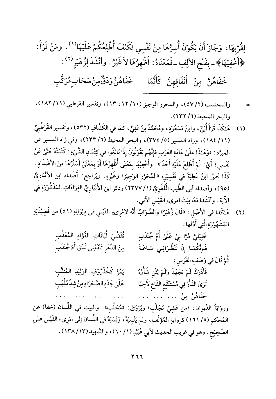 (¬1) هكَذَا قَرَأَ أُبَيٌّ، وابنُ مَسْعُوْدٍ، ومُحَمَّدُ بنُ عَلِيٍّ، كَمَا في الكَشَّافِ (532)، وتَفسير القُرْطُبِيِّ (11/ 184)، وزاد المسير (5/ 375)، والبحر المحيط (6/ 233)، وفي زاد المسير عن المبرِّد: "وَهَذَا علَى عَادَةِ العَرَبِ فإِنَّهُم يَقُوْلُوْنَ إِذَا بَالغُوا في كِتمَانِ الشَّيءِ: كَتمْتُهُ حَتَّى عَنْ نَفْسِي؛ أَي: لَمْ أُطْلِعْ عَلَيهِ أَحَدًا". وأَخْفِيهَا بِمَعْنَى أُظْهِرُهَا أَوْ بِمَعْنَى أَسْتُرُهَا منَ الأضْدَادِ. كَذَا نَصَّ ابنُ عَطِيَّةَ في تَفْسِيرِهِ "المُحَرَّرِ الوَجِيزِ" وغَيرِهِ. ويُراجع: أَضْداد ابن الأنْبَارِيِّ (95)، وأضداد أبي الطَّيب الُّلغَويِّ (1/ 2377) وذكر ابن الأنْبَارِيِّ القِرَاءَاتِ المَذْكُوْرَةِ في الآية. وأنْشَدَا مَعًا بيتَ امرئِ القَيسِ الآتي.