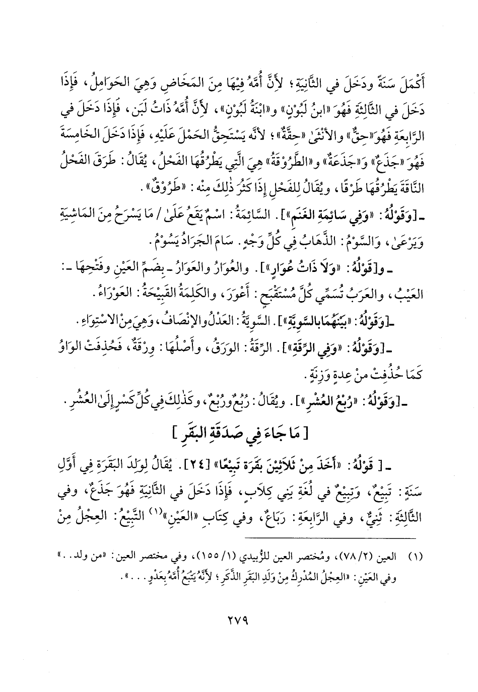 -[قَوْلُهُ: "أَخَذَ مِنْ ثَلَاثِينَ بَقَرَة تَبِيعًا" [24]. يُقَال لِوَلدَ البَقَرَةِ في أَوَّلِ سَنَةٍ: تَبِيعٌ، وَتِبِيعٌ في لُغَةِ بَنِي كِلَابٍ، فَإذَا دَخَلَ في الثَّانِيَةِ فَهُوَ جَذَعٌ، وفي الثَّالِثَةِ: ثَنِيٌّ، وفي الرَّابِعَةِ: رَبَاعٌ، وفي كِتَابِ "العَينِ" (¬1) التَّبِيعُ: العِجْلُ مِنْ