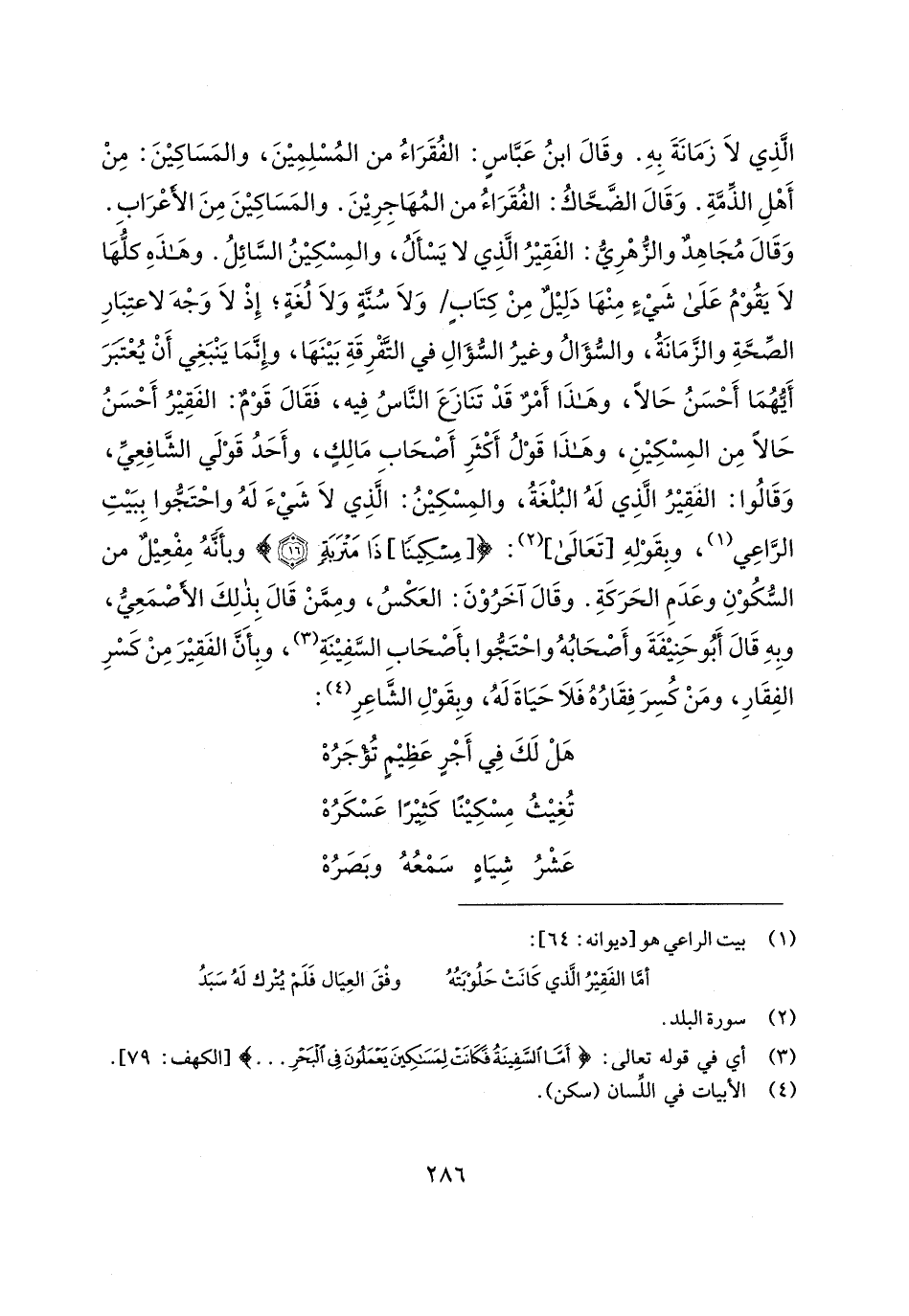 الَّذِي لَا زَمَانَةَ بِهِ. وقَال ابنُ عَبَّاسٍ: الفُقَرَاءُ من المُسْلِمِينَ، والمَسَاكِينَ: مِنْ أَهْلِ الذِّمَّةِ. وَقَال الضَّحَّاكُ: الفُقَرَاءُ من المُهَاجِرِينَ. والمَسَاكِينَ مِنَ الأَعْرَابِ. وَقَال مُجَاهِدٌ والزُّهْرِيُّ الفَقِيرُ الَّذِي لا يَسْأَلُ، والمِسْكِينُ السَّائِلُ. وهَذَهِ كلُّهَا لَا يَقُوْمُ عَلَى شَيءٍ مِنْهَا دَلِيلٌ مِنْ كِتَابٍ وَلَا سُنَّةٍ وَلَا لُغَةٍ، إِذْ لَا وَجْهَ لاعتِبَارِ الصِّحَّةِ والزَّمَانَةُ، والسُّؤَالُ وغيرُ السُّؤَالِ في التفْرِقَةِ بَينَهَا، وإِنَّمَا يَنْبَغِي أَنْ يُعْتبَرَ أَيُّهُمَا أَحْسَنُ حَالًا، وهَذَا أَمْرٌ قَدْ تنازَعَ النَّاسُ فِيه، فَقَال قَوْمٌ: الفَقِيرُ أَحْسَنُ حَالًا مِن المِسْكِينِ، وهَذَا قَوْلُ أَكْثَرِ أَصْحَاب مَالِكٍ، وأَحَدُ قَوْلَي الشَّافِعِيِّ، وَقَالُوا: الفَقِيرُ الَّذِي لَهُ البُلْغَةُ، والمِسْكِينُ: الًّذِي لَا شَيءَ لَهُ واحْتَجُّوا بِبَيتِ الرَّاعِي (¬1)، وبِقَوْلهِ [تَعَالى] (¬2): {[مِسْكِينًا] ذَا مَتْرَبَةٍ (16)} وبأَنَّهُ مِفْعِيلٌ من السُّكُوْنِ وعَدَمِ الحَرَكَةِ. وقَال آخَرُوْنَ: العَكْسُ، ومِمَّنْ قَال بِذلِكَ الأَصْمَعِيُّ، وبِهِ قَال أَبُو حَنِيفَةَ وأَصْحَابهُ واحْتَجُّوا بأَصْحَابِ السَّفِينَةِ (¬3)، وبِأنَّ الفَقِيرَ مِنْ كَسْرِ الفِقَارِ، ومَنْ كُسِرَ فِقَارُه فَلَا حَيَاةَ لَهُ، وبِقَوْلِ الشَّاعِرِ (¬4):