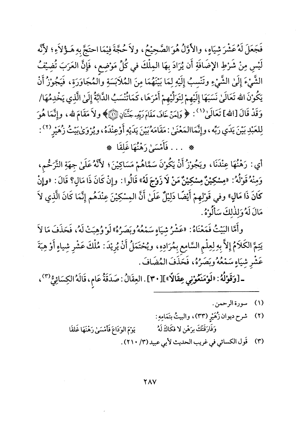 فَجَعَلَ لَهُ عَشْرَ شِيَاهٍ، والأوَّلُ هُوَ الصَّحِيحُ، ولَا حُجَّةَ فِيمَا احتَجَّ بِهِ هَؤُلَاءِ؛ لِأنَّه لَيسِ مِنْ شَرْطِ الإضَافَةِ أَن يُرَادَ بِهَا المِلْكَ في كُلِّ مَوْضِعٍ، فَإِنَّ العَرَبَ تُضِيفُ الشَّيءَ إِلَى الشَّيءِ وتَنْسِبُ إِلَيهِ لِمَا بَينَهُمَا مِنَ المُلَابَسَةِ والمُجَاوَرَةِ، فَيَجُوْزُ أَنْ يَكُوْنَ الله تَعَالى نَسَبَهَا إِلَيهِمْ لِتَوَلِّيهِمْ أَمْرَهَا، كَمَا تُنْسَبُ الدَّابَّةُ إِلَى الَّذِي يَخْدِمُهَا وَقَدْ قَال [الله] تَعَالى (¬1): {وَلِمَنْ خَافَ مَقَامَ رَبِّهِ جَنَّتَانِ} ولَا مَقَامَ لله، وإِنَّمَا هُوَ لِلعَبْدِ بَينَ يَدَي رَبِّه، وإِنَّمَا المَعْنَى: مَقَامَهُ بَينَ يَدَيهِ أَوْ عِنْدَهُ، ويُرْوَى بَيتُ زُهَيرٍ (¬2):