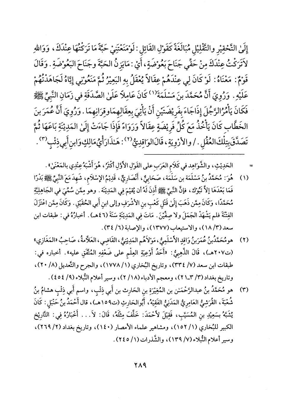 إِلَى التَّحْقِيرِ والتقليلِ مُبَالغَةً كَقَوْلِ القَائِلِ: لَوْ مَنَعْتَنِي حَبَّةً مَا تَرَكْتُهَا عِنْدَكَ، وَوَاللهِ لَا تَرَكْتُ عِنْدَكَ مِنْ حَقِّي جَنَاحَ بَعُوْضةٍ، أَي: مَا يَزِنُ الحَبَّةَ وجَنَاحَ البَعُوْضَةِ. وَقَال قَوْمٌ: مَعْنَاهُ: لَوْ كَانَ لِي عِنْدَهُمْ عِقَالًا يُعْقَلُ بِهِ البَعِيرُ ثُمَّ مَنَعُوْنِي إِيَّاهُ لَجَاهَدْتُهُمْ عَلَيهِ. وَرُويَ أَنَّ مُحَمَّدَ بنَ مَسْلَمَةَ (¬1) كَانَ عَامِلًا عَلَى الصَّدَقَةِ في زَمَانِ النَّبِيِّ - صلى الله عليه وسلم - فَكَانَ يَأْمُرُ الرَّجُلَ إِذَا جَاءَ بِفَرِيضَتينِ أَنْ يَأْتِيَ بِعِقَالِهِمَا وقِرَانِهِمَا. وَرُويَ أَنَّ عُمَرَ بنَ الخَطَّابِ كَانَ يَأْخُذُ مَعَ كُلِّ فَرِيضَةٍ عِقَالًا وَرَوَاءً فَإِذَا جَاءَتْ إِلَى المَدِينَةِ بَاعَهَا ثُمَّ تَصَدَّقَ بِتِلْكَ العُقُلِ. والأرْويَةِ، قَال الوَاقِدِيُّ (¬2): هَذَا رَأْيُ مَالِكٍ وَابنِ أَبِي ذِئْبٍ (¬3).