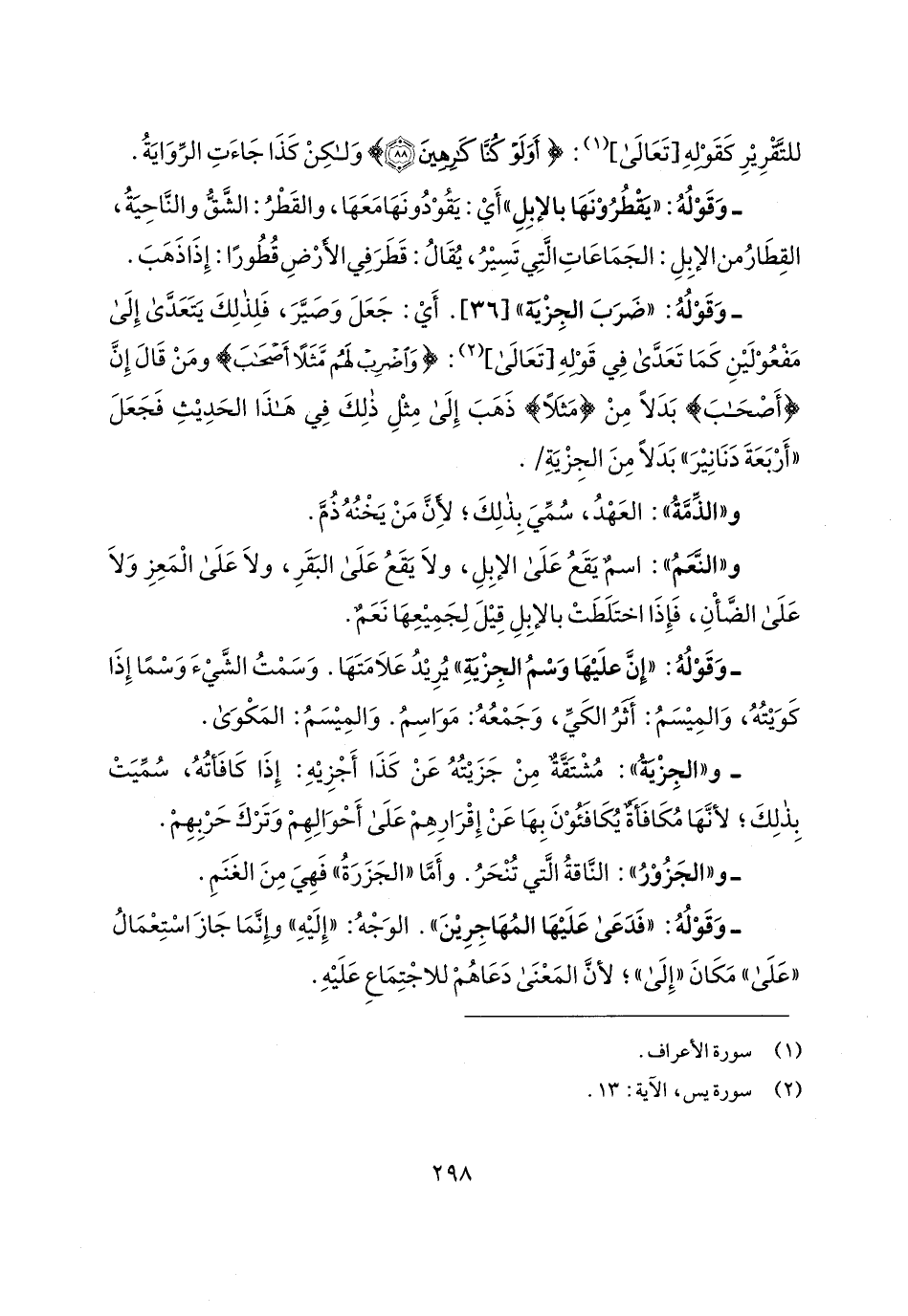 - و"الجِزْيةُ": مُشْتَقَّةٌ مِنْ جَزَيتُهُ عَنْ كَذَا أَجْزِيهِ: إِذَا كَافَأتُهُ، سُمِّيَتْ بِذلِكَ؛ لأنَّهَا مُكَافَأةٌ يُكَافَئُوْنَ بِهَا عَنْ إِقْرَارِهِمْ عَلَى أَحْوَالِهِمْ وَتَرْكَ حَرْبِهِمْ.