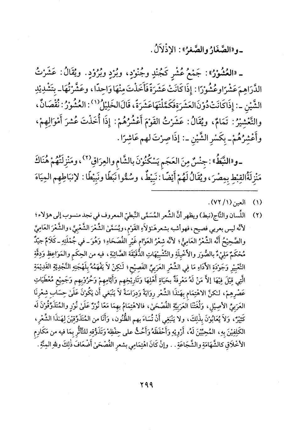 (¬2) اللِّسان والتَّاج (نبط) ويظهر أنَّ الشِّعر المُسَمَّى النَّبطيّ المعروف في نجد منسوب إلى هؤلاء؛ لأنَّه ليس بعربي فصيح، فهو أشبه بشعر هَؤلَاءِ القَوْمِ، ويُسَمَّى الشِّعْرَ الشَّعْبِيَّ، والشَّعْرَ العَامِيَّ والصَّحِيحُ أنَّه الشِّعْرُ العَامِيُّ؛ لأنَّه شِعْرُ العَوَّامِ غَيرِ الفُصَحَاءِ؛ وَهُوَ - في جُمْلَتِهِ - كَلَامٌ جيّدٌ مُحْكَمٌ مَلِيءٌ بالصُّوَر والأَخْيِلَةِ والتَّشْبِيهَاتِ الدُّقَيقَة الصَّائِبَةِ، فيه من الحِكَمِ والمَوَاعِظِ وَدِقَّةِ التَّعْبِيرِ وَجَوْدَةِ الأدَاءِ مَا في الشِّعْرِ العَرَبِيِّ الفَصِيحِ؛ لكِنْ لَا يَفْهَمُهُ بِلَهْجَتِهِ النَّجْدِيَّةِ القَدِيمَةِ الَّتِي قِيلَ فِيهَا إلا مَنْ لَهُ مَعْرِفَةٌ بحَيَاةِ أَهْلِهَا وَتَارِيخِهِم وَأَيَّامِهِمْ وَحُرُوْبِهِم وَجَمِيع مُعْطَيَاتِ عَصْرِهِمْ، لكنَّ الاهْتِمَامِ بِهَذَا الشِّعْر رِوَايَةَ وَدِرَاسَةً لَا يَنْبَغي أَن يَكُوْنَ عَلَى حِسَابِ شِعْرِنَا العَرَبِيِّ الأصِيلِ، وَلُغَتَنَا العَرَبِيَّةِ الفُصْحَى، فالاهْتِمَامُ بهِمَا مَعًا نُوْرٌ عَلَى نُوْرٍ والمُتَذَوِّقُوْنَ لَه كَثيرٌ، وَلَا يُعَابُوْنَ بِذلِكَ، ولا يَنْبَغِي أَنْ تُسَاءَ بهم الظُّنُون، وَأَنَا من المُتَذَوِّقِينَ لِهَذَا الشِّعْرِ، الكَلِفِينَ بِهِ، المُحِبِّينَ لَهُ، أَرْويهِ وَأَحْفَظَهُ وَأَحُثُّ على حِفْظِه وَتَذَوُّقِهِ للتَّأثُّرِ بِمَا فيه من مَكَارِمِ الأخْلَاقِ كالشَّهَامَةِ والشَّجَاعَةِ .. وإِنْ كَانَ اهْتِمَامِي بشعرِ الفُصْحَى أَضْعَافَ ذلِكَ وللهِ المِنَّةِ.