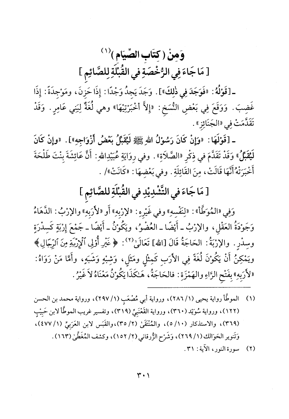 (¬1) الموطَّأ رواية يحيى (1/ 286)، ورواية أبي مُصْعَبٍ (1/ 297)، ورواية محمَّد بن الحسن (122)، ورواية سُوَيد (360)، ورواية القَعْنَبِيِّ (319)، وتفسير غريب الموطَأ لابن حَبِيبٍ (369)، والاستذكار (10/ 5)، والمُنْتَقَى (2/ 35)، والقَبَس لابن العَرَبِيِّ (1/ 477)، وَتَنوير الحَوَالك (1/ 269)، وَشَرْح الزُّرقاني (2/ 152)، وكشف المُغَطَّى (163).