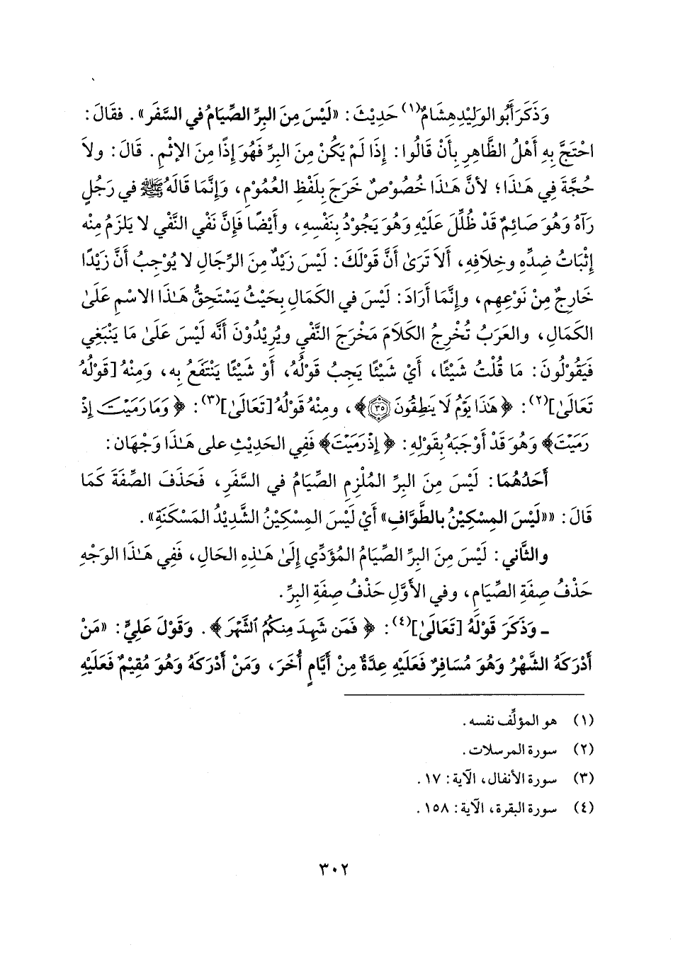 وَذَكَرَ أَبُو الوَليدِ هِشَامٌ (¬1) حَدِيثَ: "لَيسَ مِنَ البِرِّ الصِّيَامُ في السَّفَر". فقَال: احْتَجَّ بِهِ أَهْلُ الظَّاهِرِ بِأَنْ قَالُوا: إِذَا لَمْ يَكُنْ مِنَ البِرِّ فَهُوَ إِذًا مِنَ الإثْمِ. قَال: ولَا حُجَّةَ في هَذَا؛ لأنَّ هَذَا خُصُوْصٌ خَرَجَ بِلَفْظِ العُمُوْمِ، وَإِنَّمَا قَالهُ - صلى الله عليه وسلم - في رَجُل رَآهُ وَهُوَ صَائِمٌ قَدْ ظُلِّلَ عَلَيهِ وَهُوَ يَجُوْدُ بِنَفْسِهِ، وأَيضًا فَإِنَّ نَفْي النَّفْي لا يَلزَمُ مِنْه إِثْبَاتُ ضِدّهِ وخِلَافِهِ، أَلَا تَرَى أَنَّ قَوْلَكَ: لَيسَ زَيد مِنَ الرِّجَالِ لا يُوْجِبُ أَنَّ زَيدًا خَارِجٌ مِنْ نَوْعِهِم، وإِنَّمَا أَرَادَ: لَيسَ في الكَمَالِ بِحَيثُ يَسْتَحِقُّ هَذَا الاسْمِ عَلَى الكَمَالِ، والعَرَبُ تُخْرِجُ الكَلَامَ مَخْرَجَ النَّفْيِ ويُرِيدُوْنَ أَنّه لَيسَ عَلَى مَا يَنْبَغِي فَيَقُوْلُونَ: مَا قُلْتُ شَيئًا، أَي شَيئا يَجِبُ قَوْلُهُ، أَوْ شَيئًا يَنْتمعُ بِه، وَمِنْهُ [قَوْلُهُ تَعَالى] (¬2): {هَذَا يَوْمُ لَا يَنْطِقُونَ}، ومِنْهُ قَوْلُهُ [تَعَالى] (¬3): {وَمَا رَمَيتَ إِذْ رَمَيتَ} وَهُوَ قَدْ أَوْجَبَهُ بِقَوْلهِ: {إِذْ رَمَيتَ} فَفِي الحَدِيثِ على هَذَا وَجْهَان: