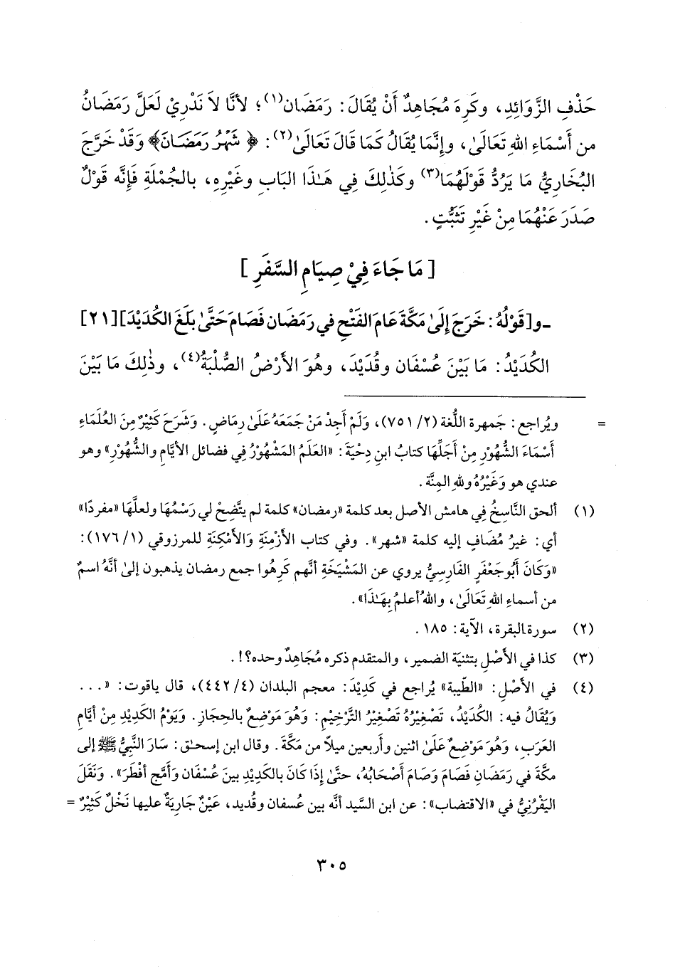 حَذْفِ الزَّوَائِدِ، وكَرِهَ مُجَاهِد أَنْ يُقَال: رَمَضَان (¬1)؛ لأنَّا لا نَدْرِي لَعَلَّ رَمَضَانُ من أَسْمَاءِ اللهِ تَعَالى، وإِنَّمَا يُقَالُ كَمَا قَال تَعَالى (¬2): {شَهْرُ رَمَضَانَ} وَقَدْ خَرَّجَ البُخَارِيُّ مَا يَرُدُّ قَوْلَهُمَا (¬3) وكَذلِكَ في هَذَا البَابِ وغَيرِهِ، بالجُمْلَةِ فَإِنَّه قَوْلٌ صَدَرَ عَنْهُمَا مِنْ غَيرِ تَثبّتٍ.