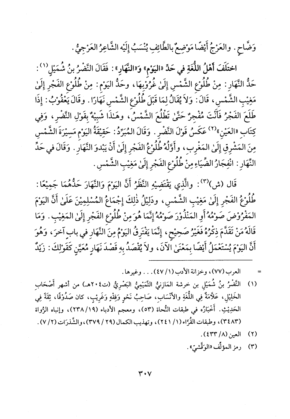 اختَلَفَ أهلُ اللُّغَةِ في حَدِّ "اليَوْمِ" وَ"النّهَارِ": فَقَال النَّضْرُ بنُ شُمَيلٍ (¬1): حَدُّ النَّهَارِ: مِنْ طُلُوع الشَّمْسِ إِلَى غُرُوْبِهَا، وحَدُّ اليَوْمِ: مِنْ طُلُوع الفَجْرِ إِلَى مَغِيبِ الشَّمْسِ، قَال: وَلَا يُقَالُ لِمَا قَبْلَ طُلُوْعِ الشَّمْسِ نَهَارًا. وقَال يَعْقُوْبُ: إِذَا طَلَعَ الفَجْرُ فَأَنْتَ مُفْجِرٌ حَتَّى تَطْلُعَ الشَّمْسُ، وهَذَا شَبِيهٌ بِقَوْلِ النَّضْرِ، وَفِي كِتَابِ "العَينِ" (¬2) عَكَسُ قَوْلَ النَّضْرِ. وَقَال المُبَرِّدُ: حَقِيقَةُ اليَوْمِ مَسِيرَةَ الشَّمْسِ مِنَ المَشْرِقِ إِلَى المَغْرِبِ، وأَوَّلُهُ طُلُوْعُ الفَجْرِ إِلَى أَنْ يَبْدوَ النَّهَارِ. وَقالَ في حَدِّ النّهَارِ: انْفِجَارُ الضِّيَاءِ مِنْ طُلُوع الفَجْرِ إِلَى مَغِيبِ الشَّمْسِ.